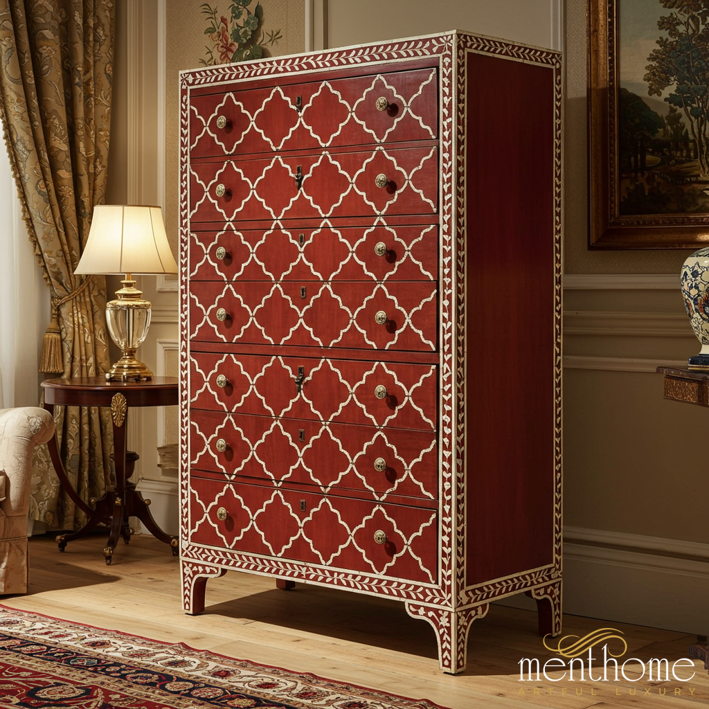 Handcrafted Red Bone Inlay Chest of Drawers | Luxury Handmade Tallboy