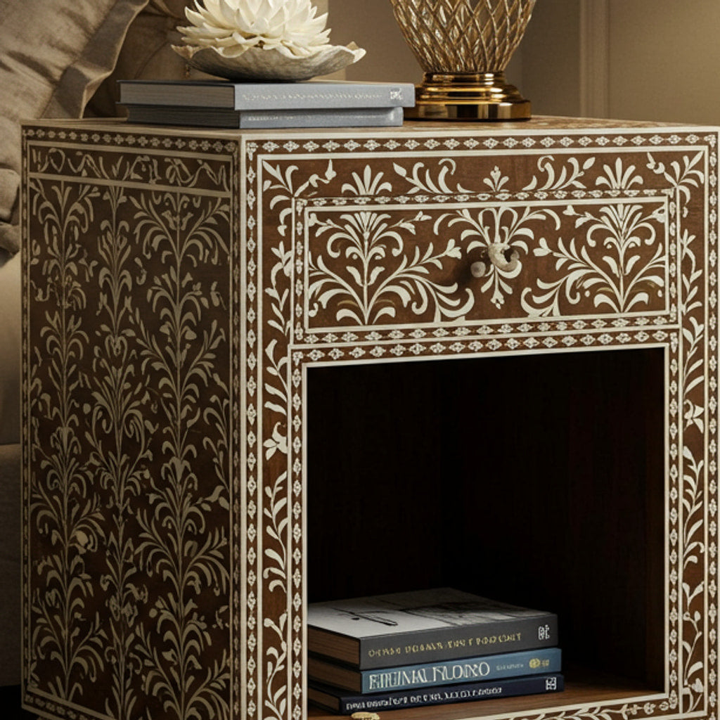 Handcrafted Wooden Bedside Table with Floral Inlay | Luxury Handmade Bedside Table