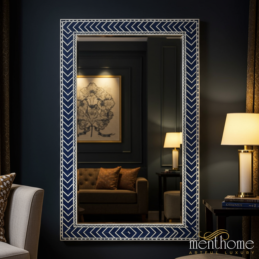 A stylish large wall mirror featuring a navy blue frame with a white chevron pattern. This decorative mirror brings a touch of elegance and sophistication to any living space, enhancing both modern and classic interiors.