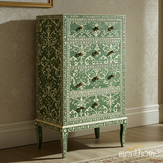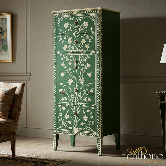 Green Floral Inlay Wooden Chest of Drawers | Luxury Handmade Chest of Drawer