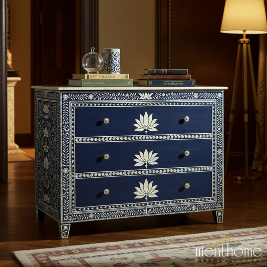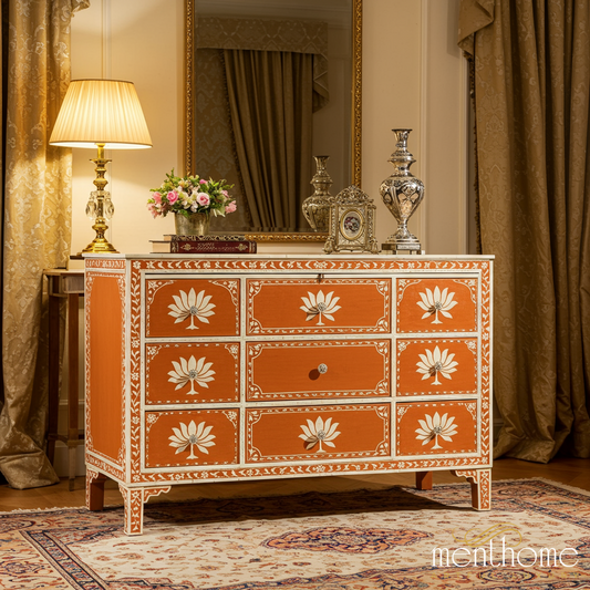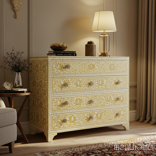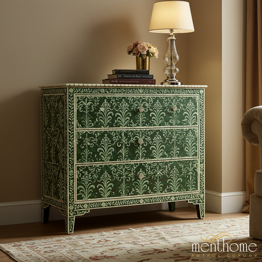 Elevate your interiors with our bone inlay chest of drawers and mother of pearl dressers, where timeless artistry meets everyday utility. Each piece is meticulously handcrafted by artisans who skillfully arrange delicate inlay patterns into durable wood, creating furniture that is both functional and decorative. With spacious drawers for organized storage and designs that double as statement décor, these chests are perfect for bedrooms, living rooms, or hallways. Every purchase supports artisan communities through fair wages and sustainable practices, while our focus on premium craftsmanship, customizable designs, and dedicated customer service ensures your chest of drawers is as meaningful as it is luxurious.