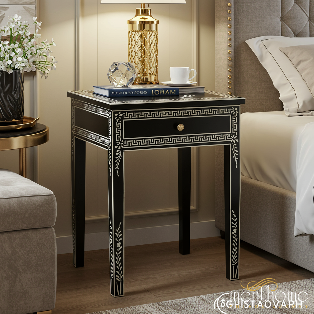 A sophisticated black side table featuring intricate white inlaid detailing and a single drawer with a brass knob, perfect for adding a touch of elegance to any bedroom or living space. Crafted with fine materials, this table combines functionality and style seamlessly.