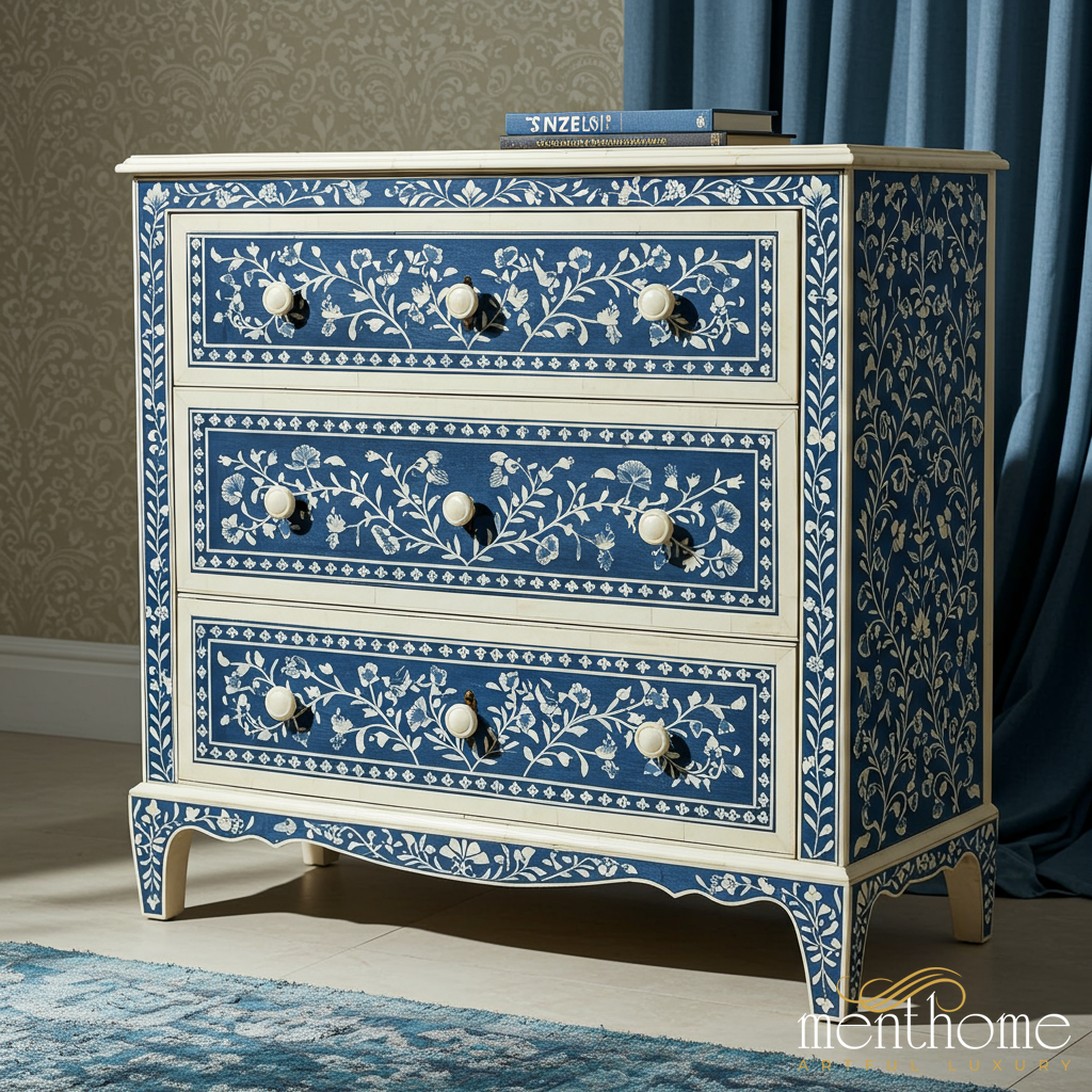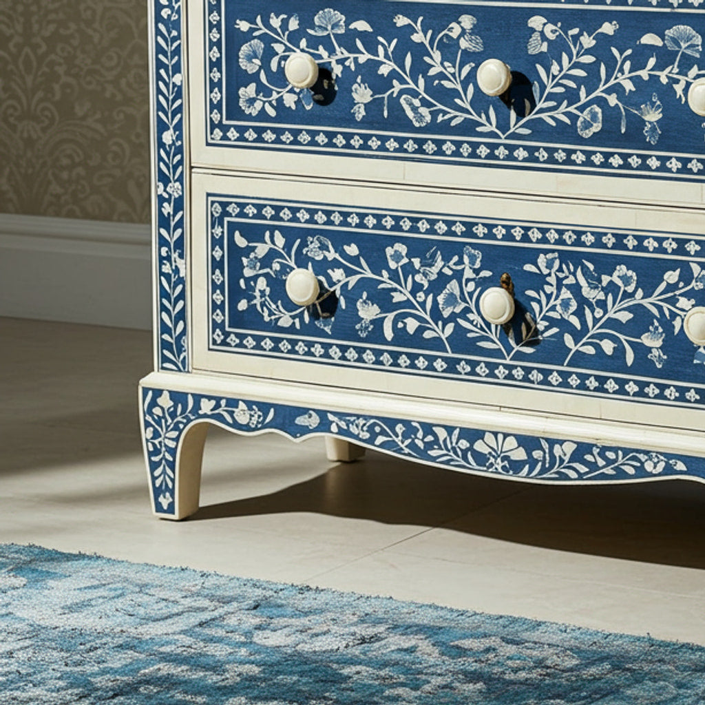 Hand-Painted Blue Floral Wooden Chest of Drawers | Luxury Handmade Chest of Drawer