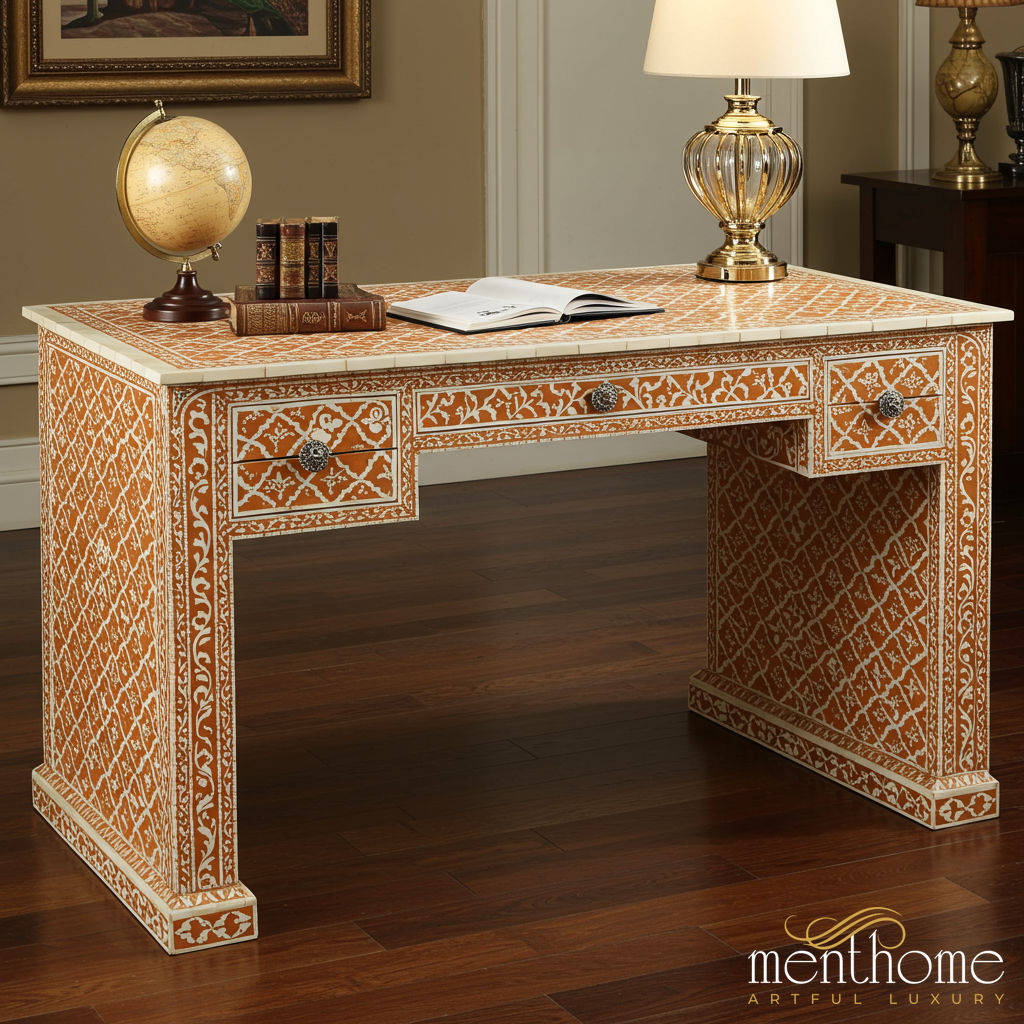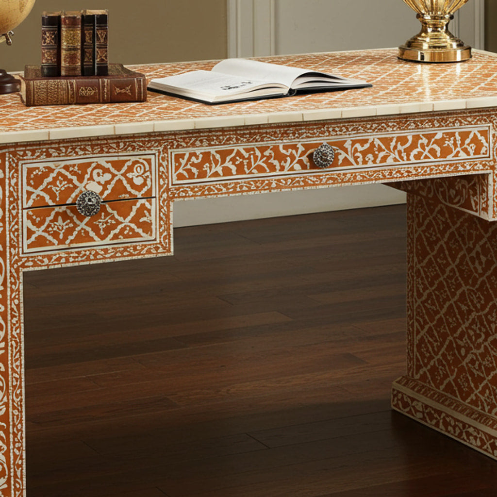 A beautifully designed handcrafted writing desk featuring intricate bone inlay patterns on a warm orange background. This desk combines elegance with functionality, offering three spacious drawers with decorative handles, perfect for organizing your office essentials.