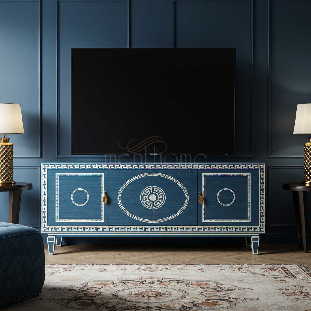 Luxury Inlay Blue TV Cabinet with Greek Key Motif | Luxury Handmade TV Cabinet