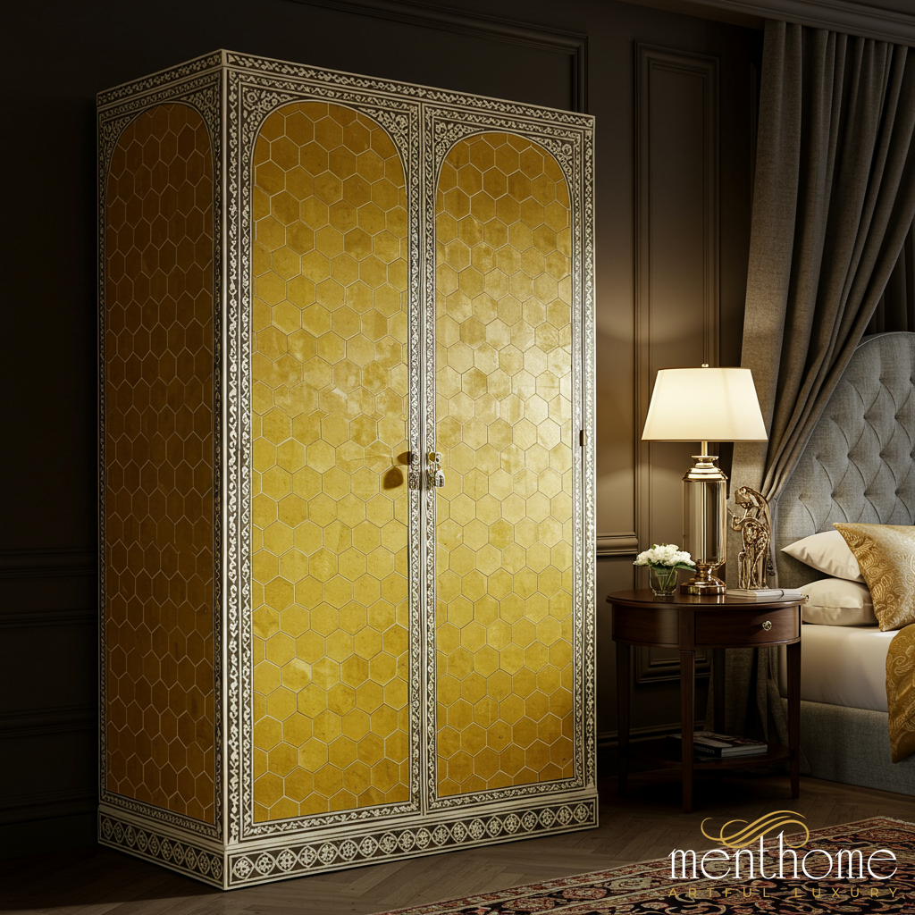 A stunning vintage wardrobe featuring a gold honeycomb pattern on its doors, framed by intricate ivory floral designs. This elegant piece combines functionality with classic artistry, ideal for adding a touch of luxury to any bedroom.