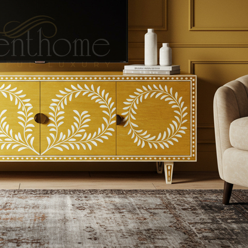 Yellow Inlay TV Cabinet with Floral Motif | Luxury Handmade TV Cabinet