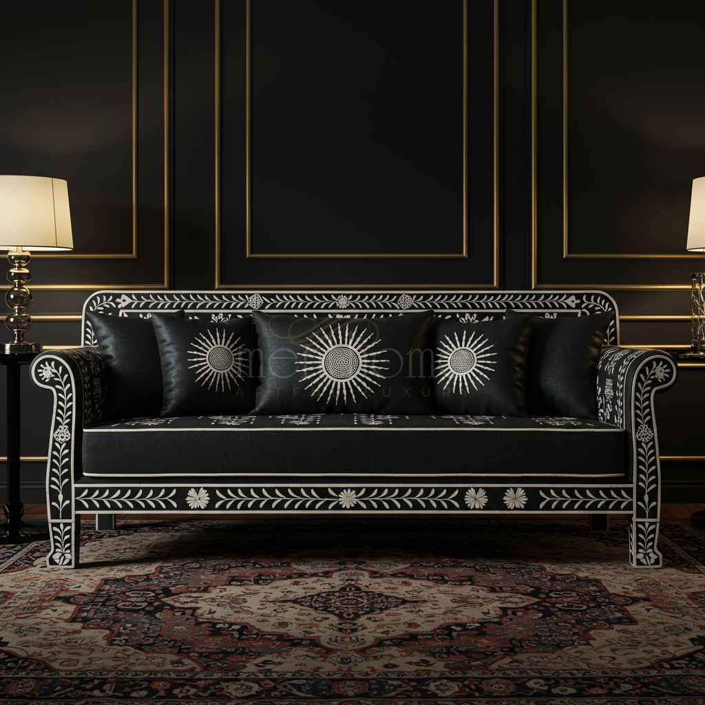 Elegant Black Inlay Sofa with Floral Motif | Luxury Handmade Sofa