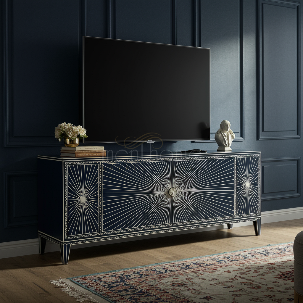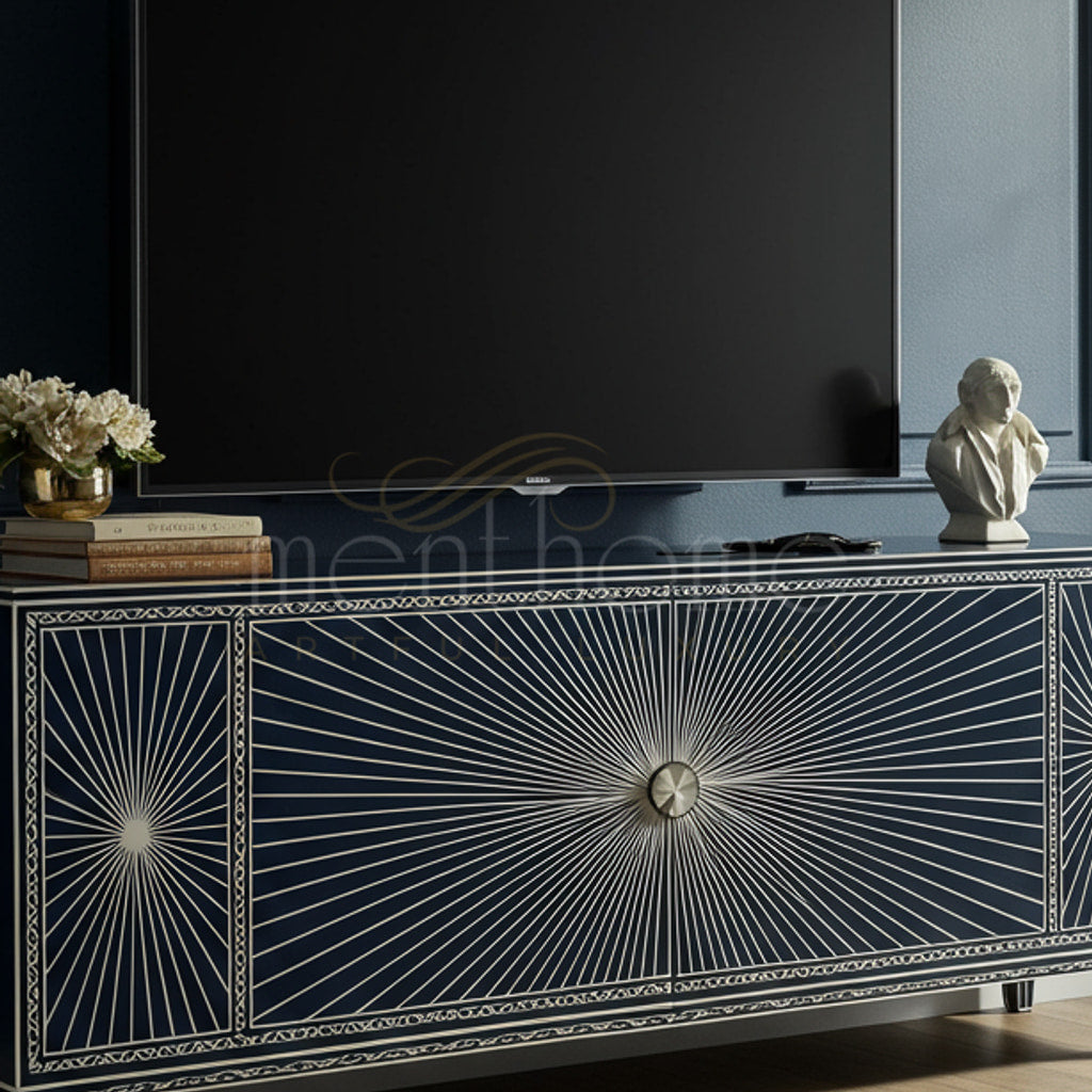 An exquisite inlay TV cabinet featuring a sophisticated starburst pattern with gold accents on a rich navy blue finish. This luxurious piece combines elegance and functionality, perfect for contemporary living spaces seeking a bold statement.
