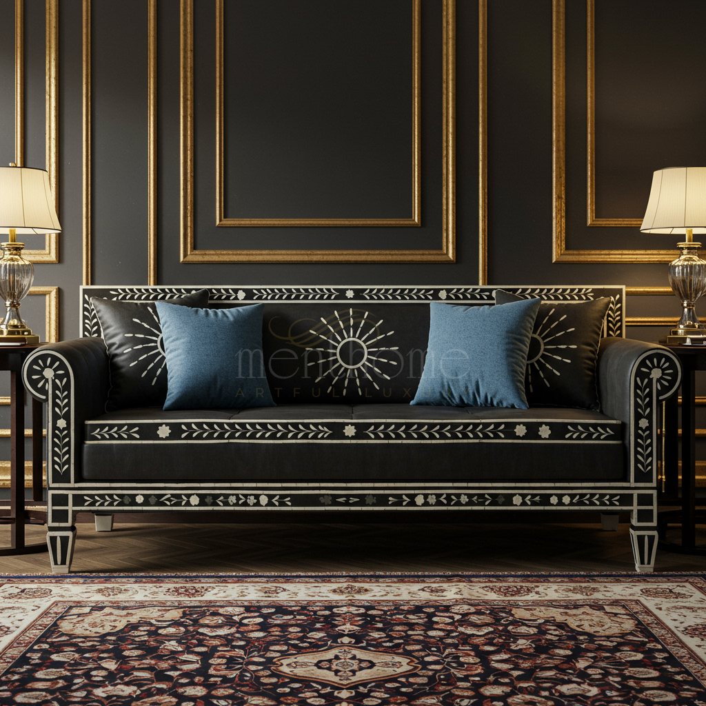 Luxury Black Inlay Sofa with Elegant Floral Motifs | Luxury Handmade Sofa
