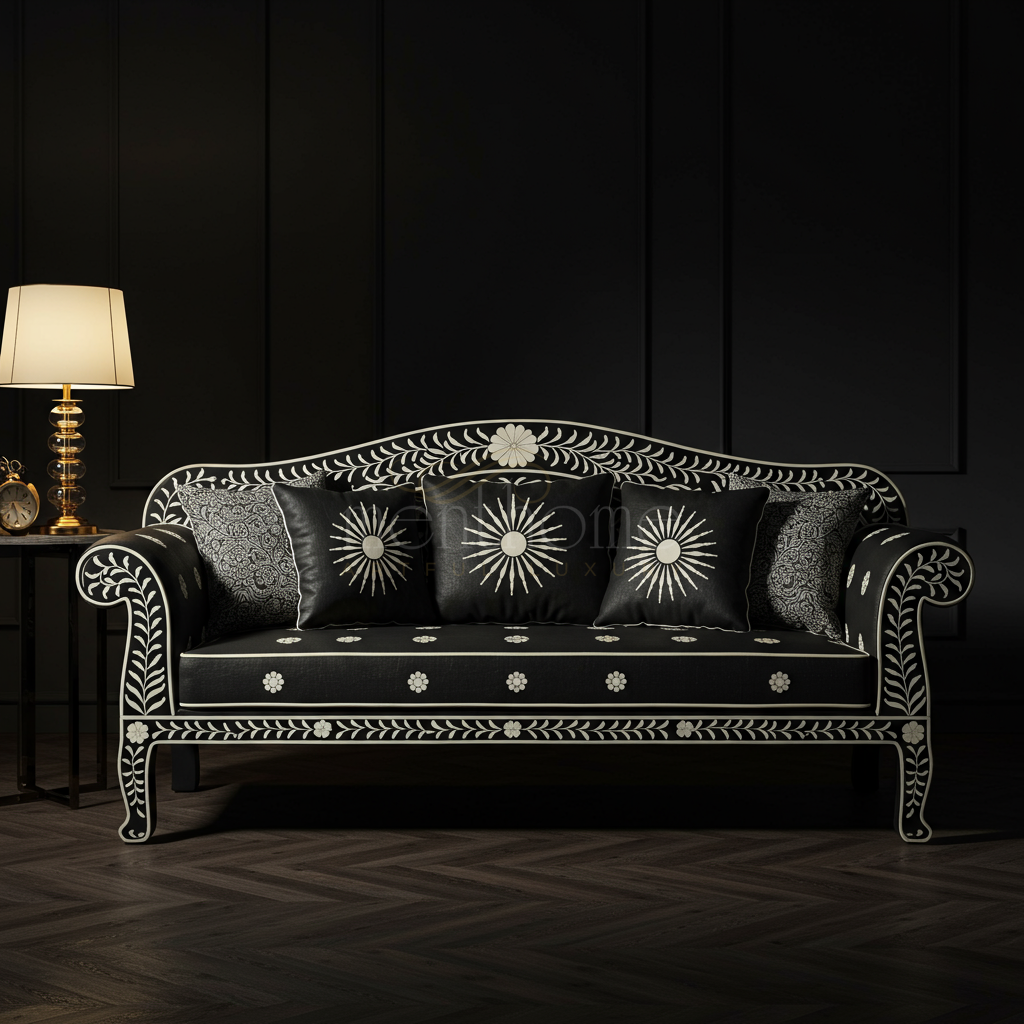 This exquisite black sofa combines intricate white floral inlay work with plush black upholstery, creating a striking centerpiece for any elegant living space. Featuring beautifully detailed hand-crafted motifs on the frame and cushions, the sofa offers luxurious comfort with a sophisticated artistic touch.