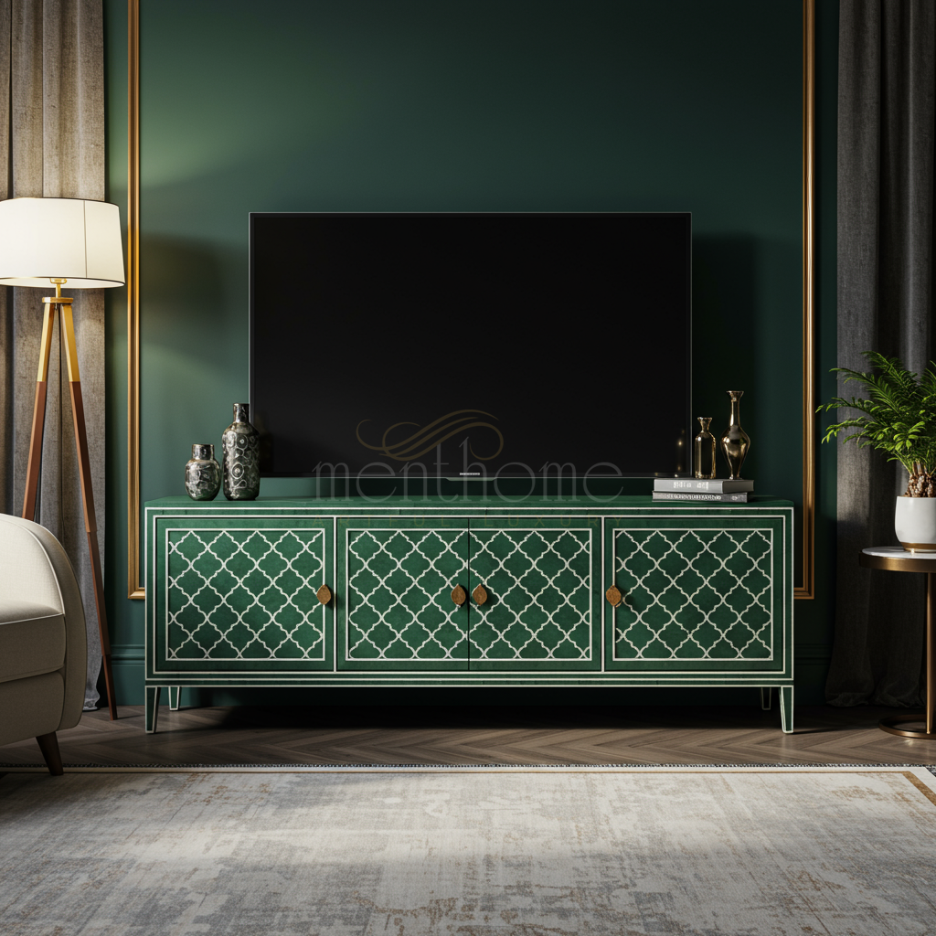 Luxury Green Inlay TV Cabinet with Geometric Pattern | Luxury Handmade TV Cabinet