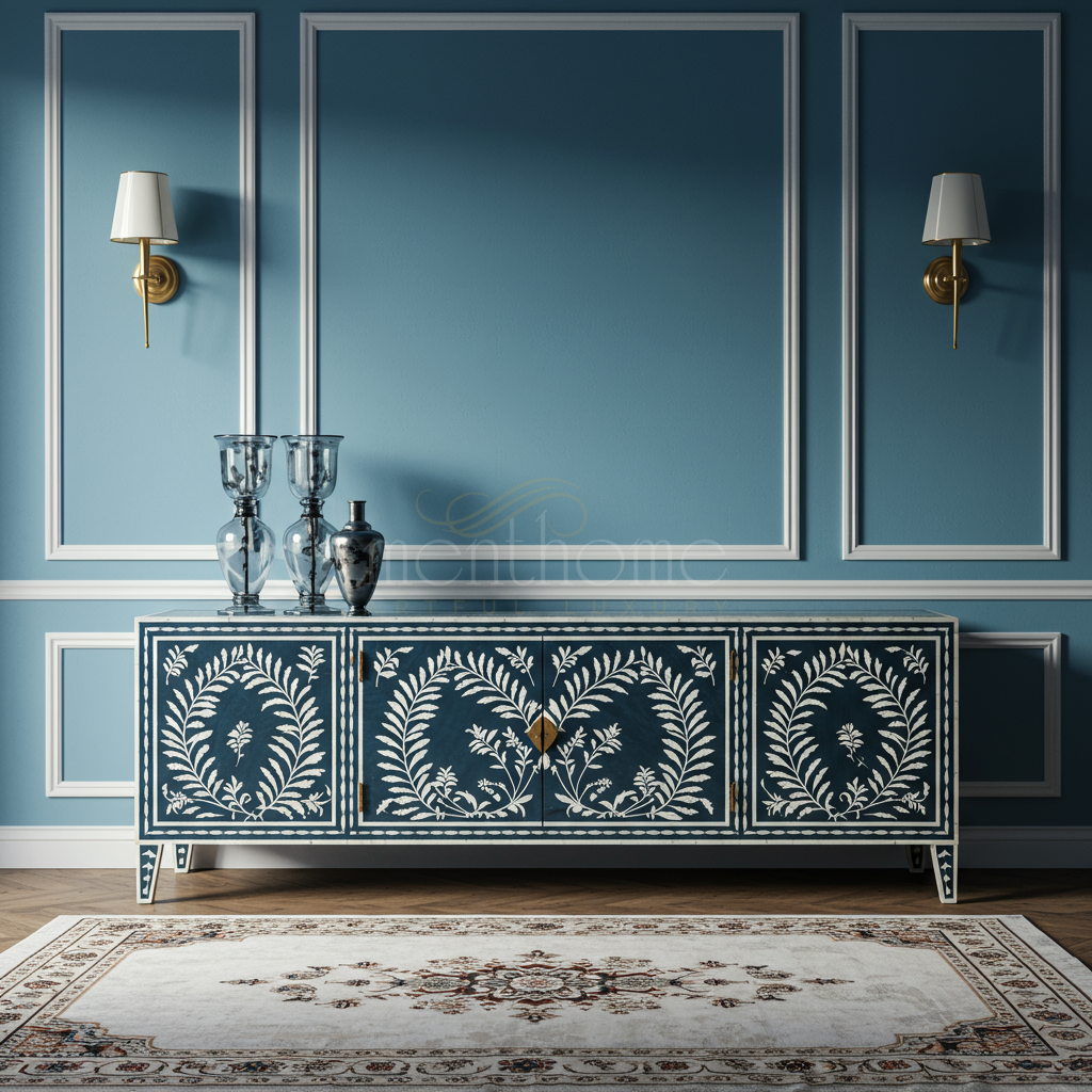 A sophisticated inlay TV cabinet featuring intricate white floral motifs on a deep navy blue background, crafted to bring elegance and charm to your living room. This exquisite piece combines traditional craftsmanship with modern functionality, perfect for stylish storage and display.