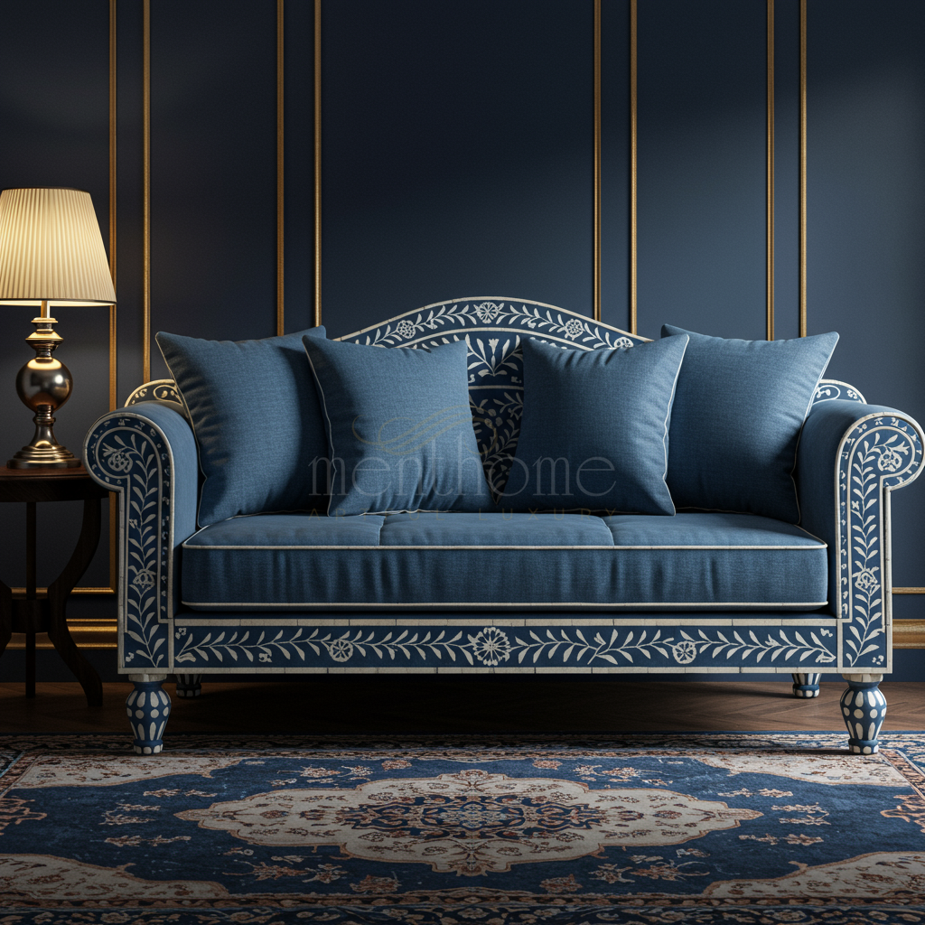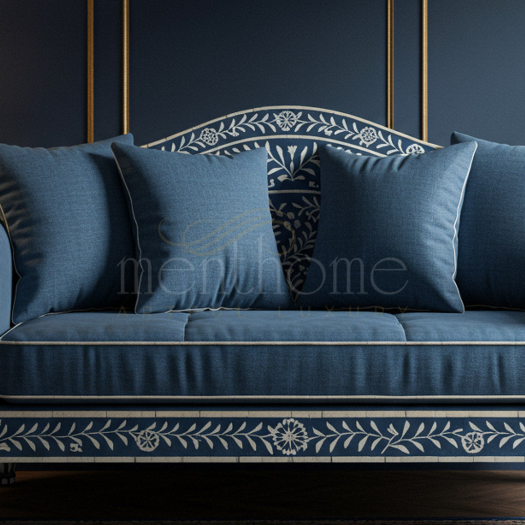 A luxurious deep blue sofa adorned with intricate white floral inlay work, blending classic craftsmanship with modern comfort. This elegant piece features plush cushions and detailed armrest patterns, perfect for adding a sophisticated touch to any living space.