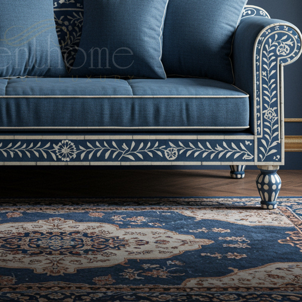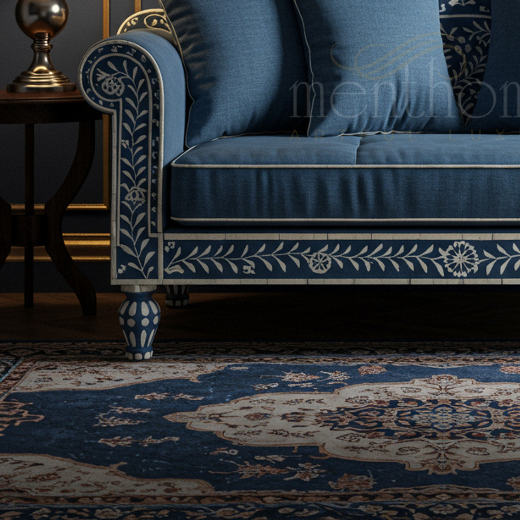 Royal Blue Inlay Sofa with Floral Motifs | Luxury Handmade Sofa