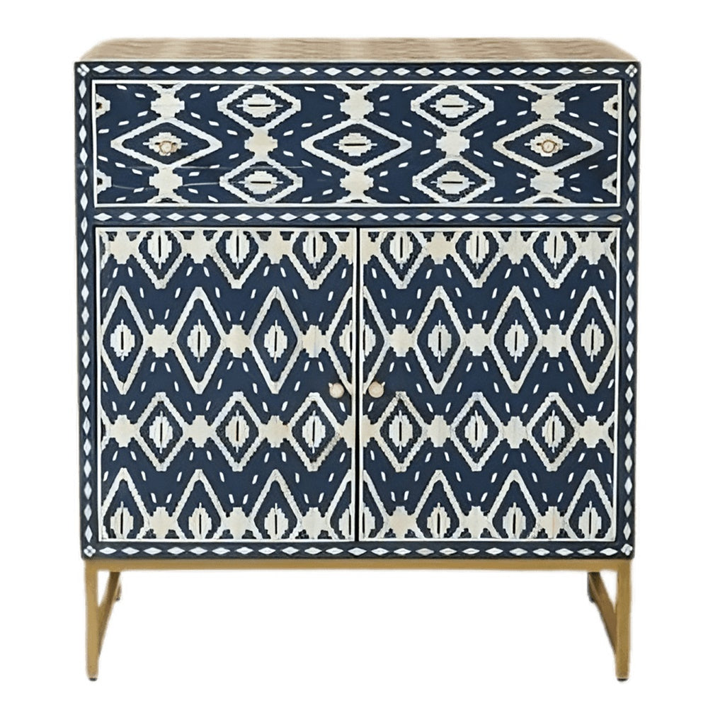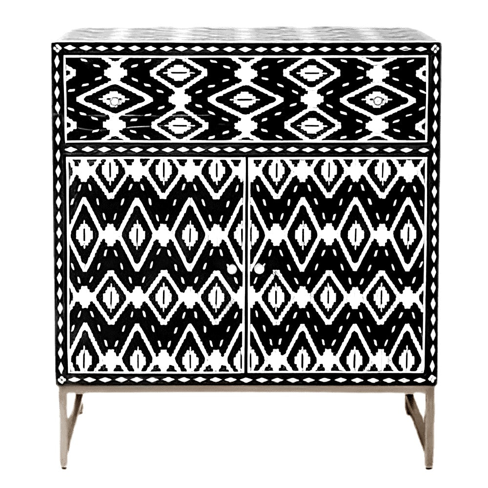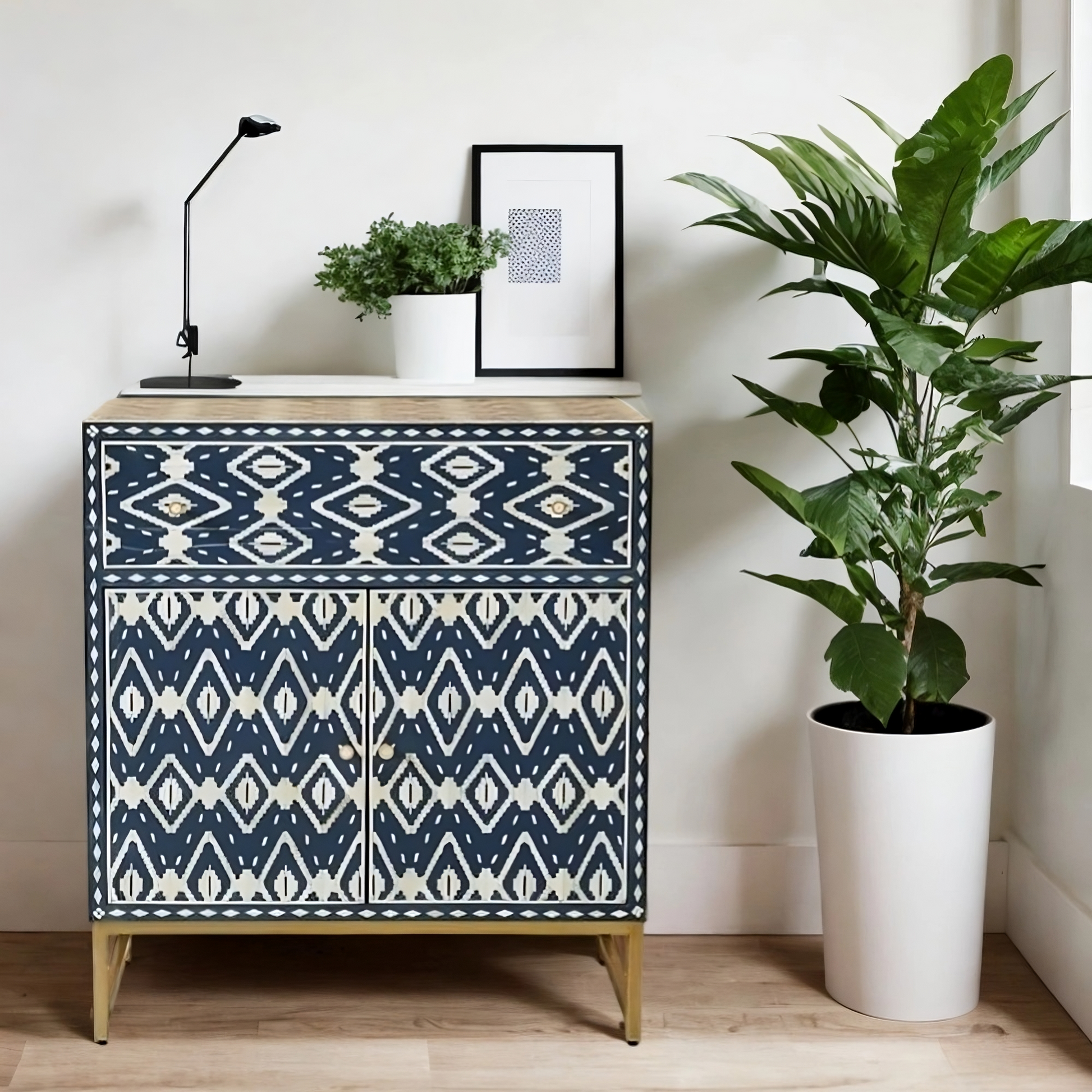 Totally unique and one of a kind, this small, bone inlay Indian Ikat Entryway Cabinet is inlaid with fragments of mirrored glass. Each fragment of glass is hand cut with special glass cutting scissors, and then laid out by skilled craftsmen in these Rangoli patterns. The effect as you walk past this chest is to see a shimmer of repeating reflections. If you become the proud owner of this hand-crafted inlaid Ikat Entryway Cabinet you could also order another glass inlaid item in the same color using our bespoke order service. Keep the room’s accessories minimal in order to emphasize the rich beauty of the statement piece. \n