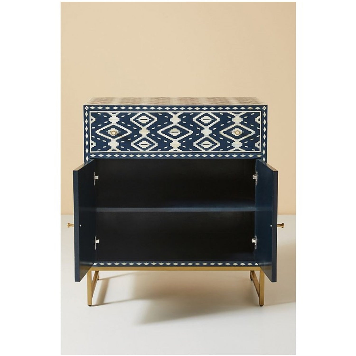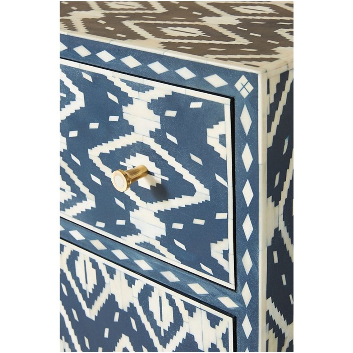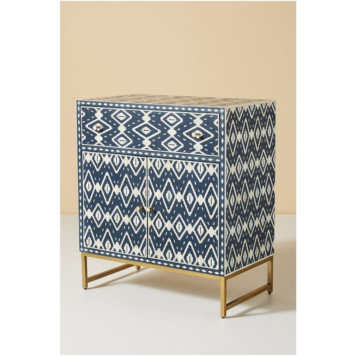 Totally unique and one of a kind, this small, bone inlay Indian Ikat Entryway Cabinet is inlaid with fragments of mirrored glass. Each fragment of glass is hand cut with special glass cutting scissors, and then laid out by skilled craftsmen in these Rangoli patterns. The effect as you walk past this chest is to see a shimmer of repeating reflections. If you become the proud owner of this hand-crafted inlaid Ikat Entryway Cabinet you could also order another glass inlaid item in the same color using our bespoke order service. Keep the room’s accessories minimal in order to emphasize the rich beauty of the statement piece. \n