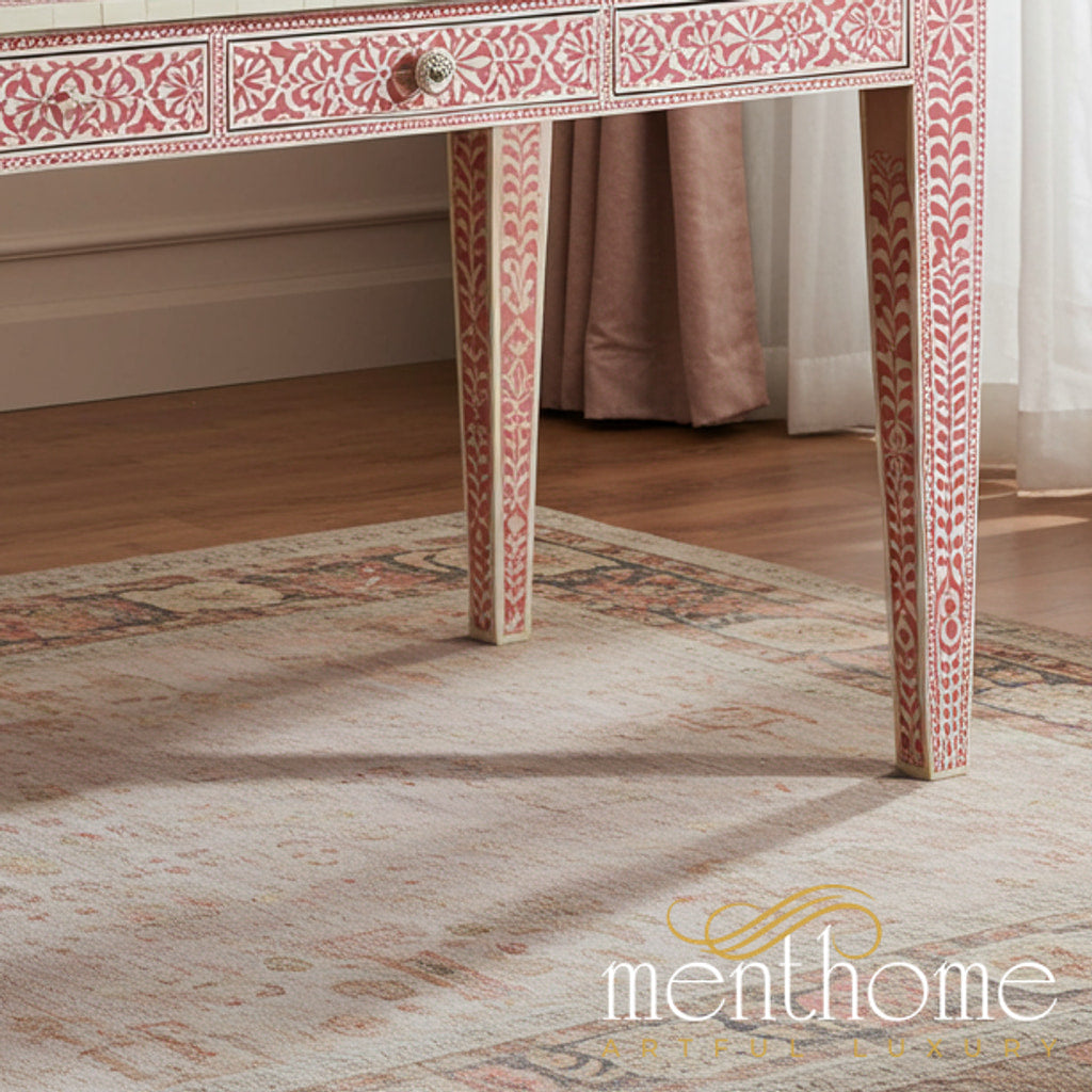 This elegant handcrafted desk features intricate red and white bone inlay floral patterns, offering a unique and artistic touch to any workspace or living area. The piece combines functionality with traditional craftsmanship, making it a standout addition to your home or office décor.