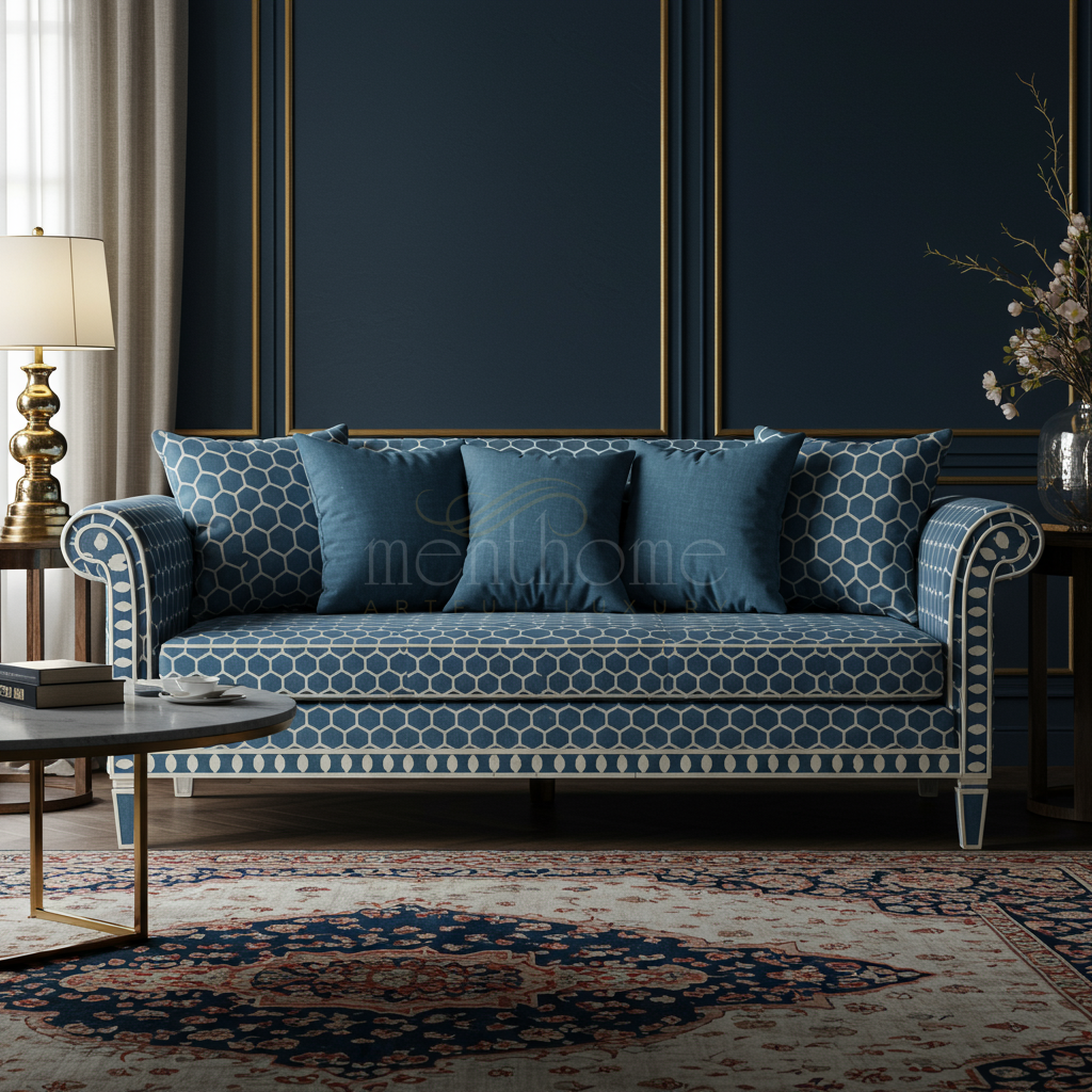 Luxury Blue Inlay Sofa with Geometric Pattern | Luxury Handmade Sofa