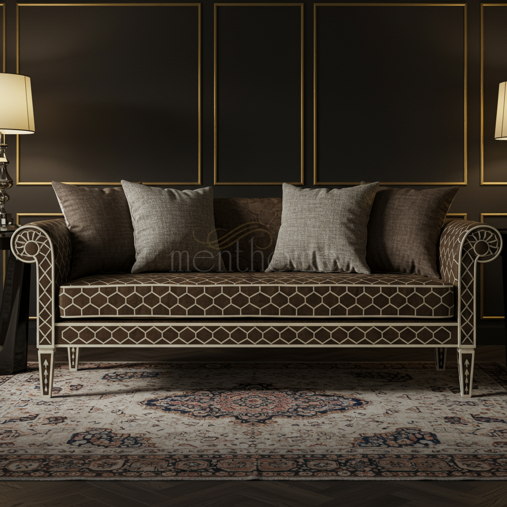 This elegant sofa features an intricate inlay design with a geometric pattern, combining luxury craftsmanship with modern comfort. Upholstered in rich brown fabric with contrasting beige inlay, it is perfect for sophisticated living spaces. The sofa includes plush cushions in complementing neutral tones for added comfort and style.