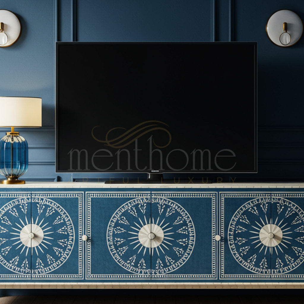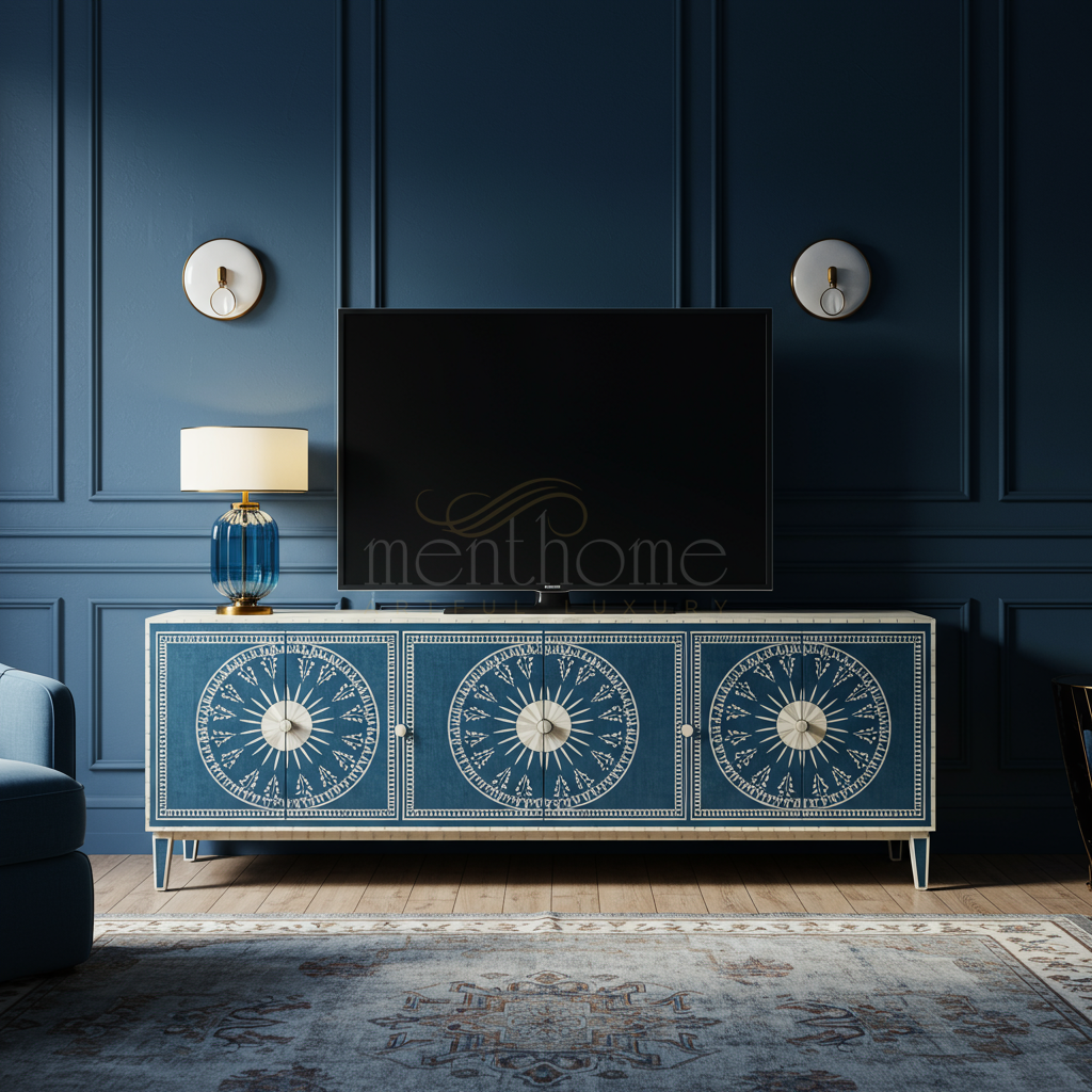 This elegant TV cabinet features exquisite inlay work with a sunburst pattern on deep blue doors, framed by a light-colored border. Crafted to blend luxury with functionality, it offers ample storage with three cabinet doors set on tapered legs, perfect for organizing media accessories while enhancing your living space's decor.