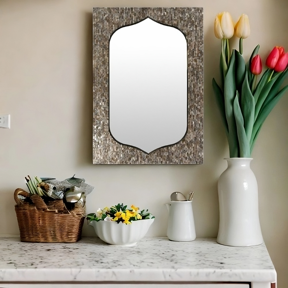 Pearl inlay Mirror Every room needs a statement piece. The frame is crafted from the bone in a Floral pattern a popular fret in design and architecture. Hang it up or lean it on top of a console. Bone inlay forms a modern graphic design with our Pearl inlay Mirror, it’s another one of those examples. An ancient tradition given new life with an updated perspective. Bone inlay refers to an ancient decorative technique that involves embedding delicate, hand-carved pieces of bone into the surface of an object. The result makes for a striking pattern–often floral or geometric–of contrasting colors and materials that add surface splend our to any room. \n \nBRAND: Menthome \n \nMATERIAL: Bone Resin & Wood \n \nDIMENSIONS: (L * W * H) = (30 x 1 x 43) Inch \n \nWEIGHT: 4 Kg \n \nCOLOR: White \n \nPACKAGE CONTENT: 1 x Mirror Frame \n \nDelivery Time: Within 30-45 Working Days \n \nNote: \n
