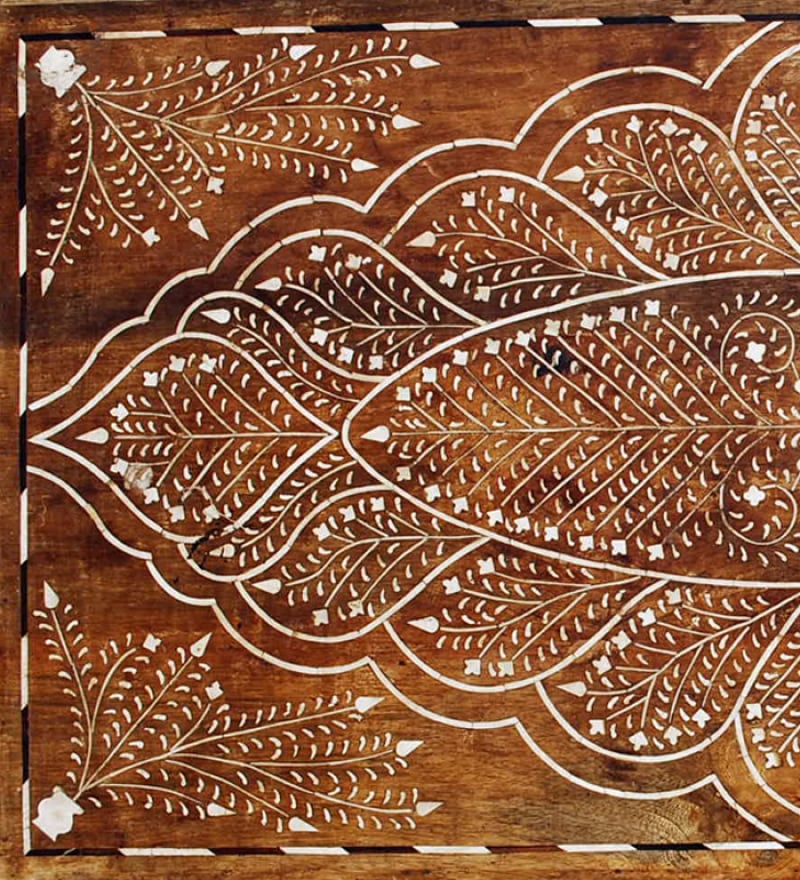 Unique and one of a kind, this small, bone-inlay Indian Teak Wood Bone Inlay Low Dining Table is inlaid with fragments of mirrored glass. Each plexiglass chip is hand-cut with special glass-cutting scissors and laid out by skilled craftsmen in these Rangoli patterns. The effect as you walk past this chest is to see a shimmer of repeating reflections. \n \nIf you become the proud owner of this hand-crafted inlaid Chevron Table, you could also order another glass inlaid item in the same color using our bespoke order service. Keep the room’s accessories minimal to emphasize the statement piece's rich beauty. \n \nBRAND: Menthome \n \nART-TYPE: Wooden Furniture \n \nMATERIAL: MDF, Bone, Resin, and Iron \n \nDIMENSIONS: (L * W * H) = (26 x 26 x 9) Inch \n \nPACKAGE CONTENT: 1 x Teak Wood Bone Dining Table \n \nDelivery Time: Within 30-45 Working Days \n \nNote: \n