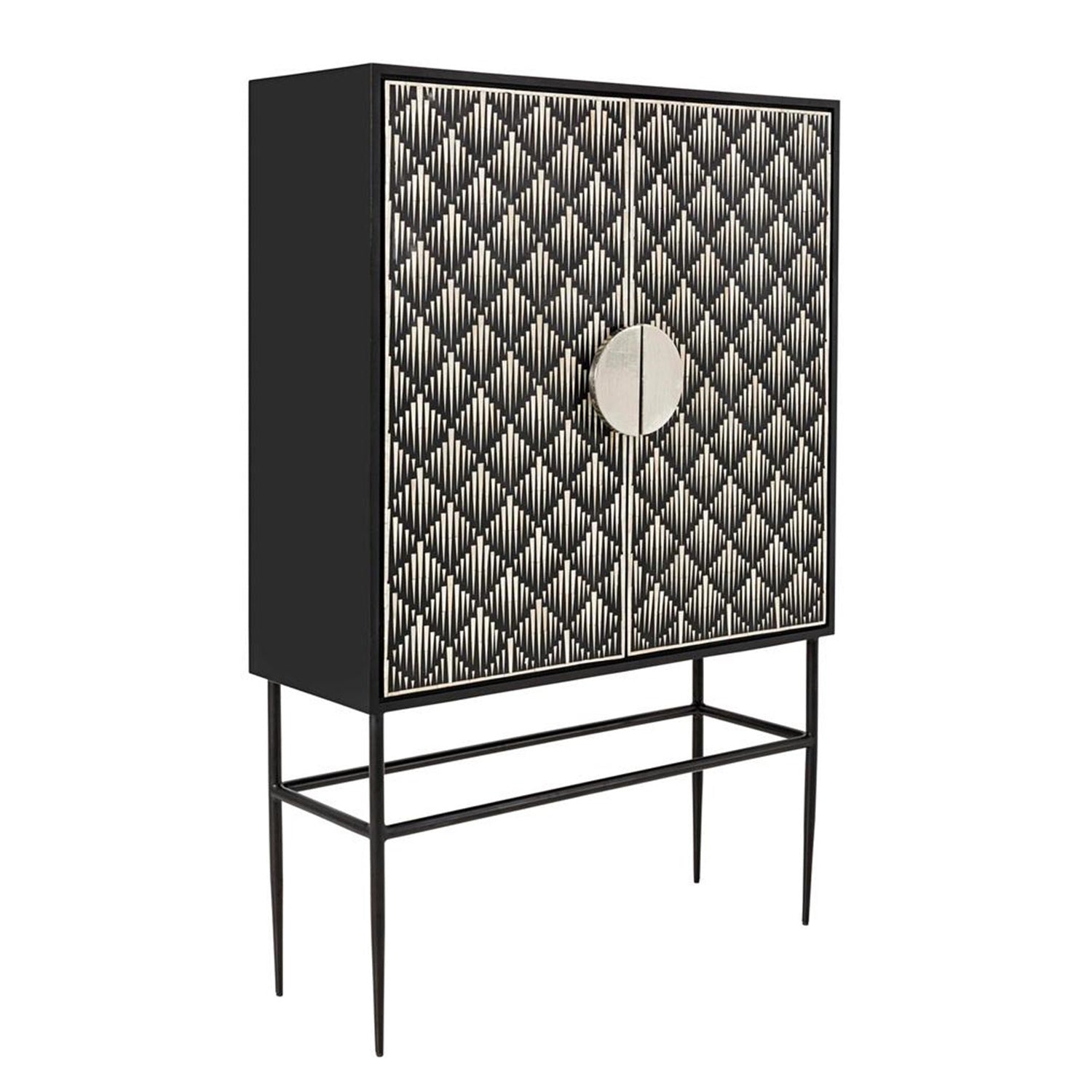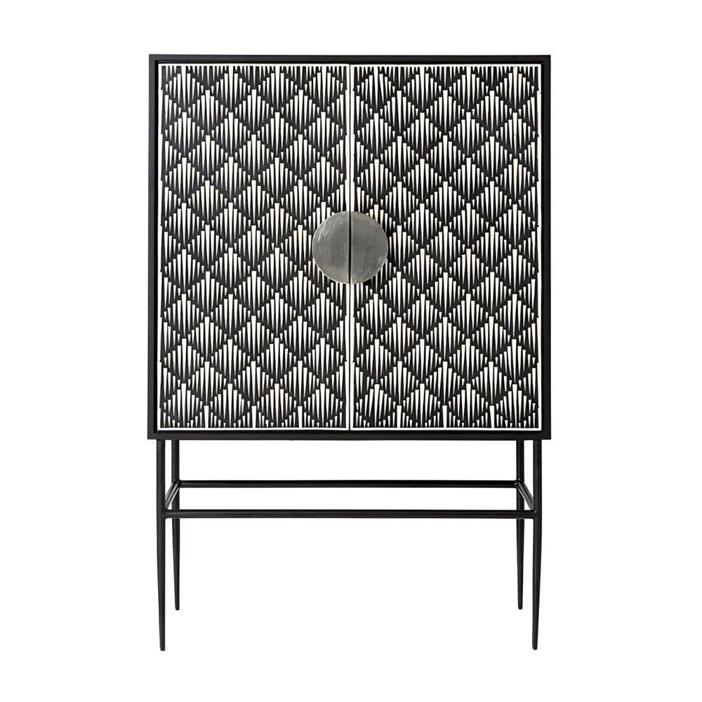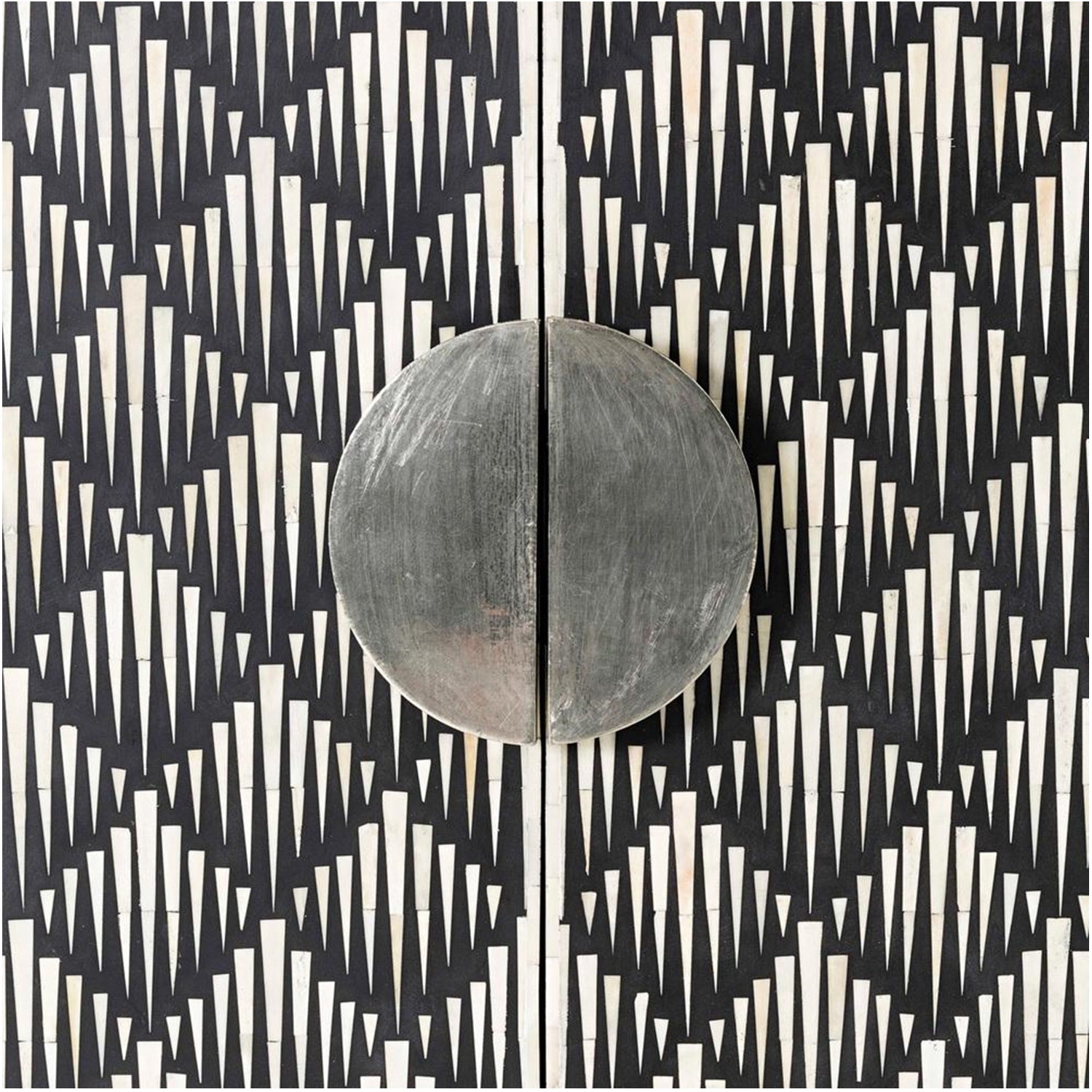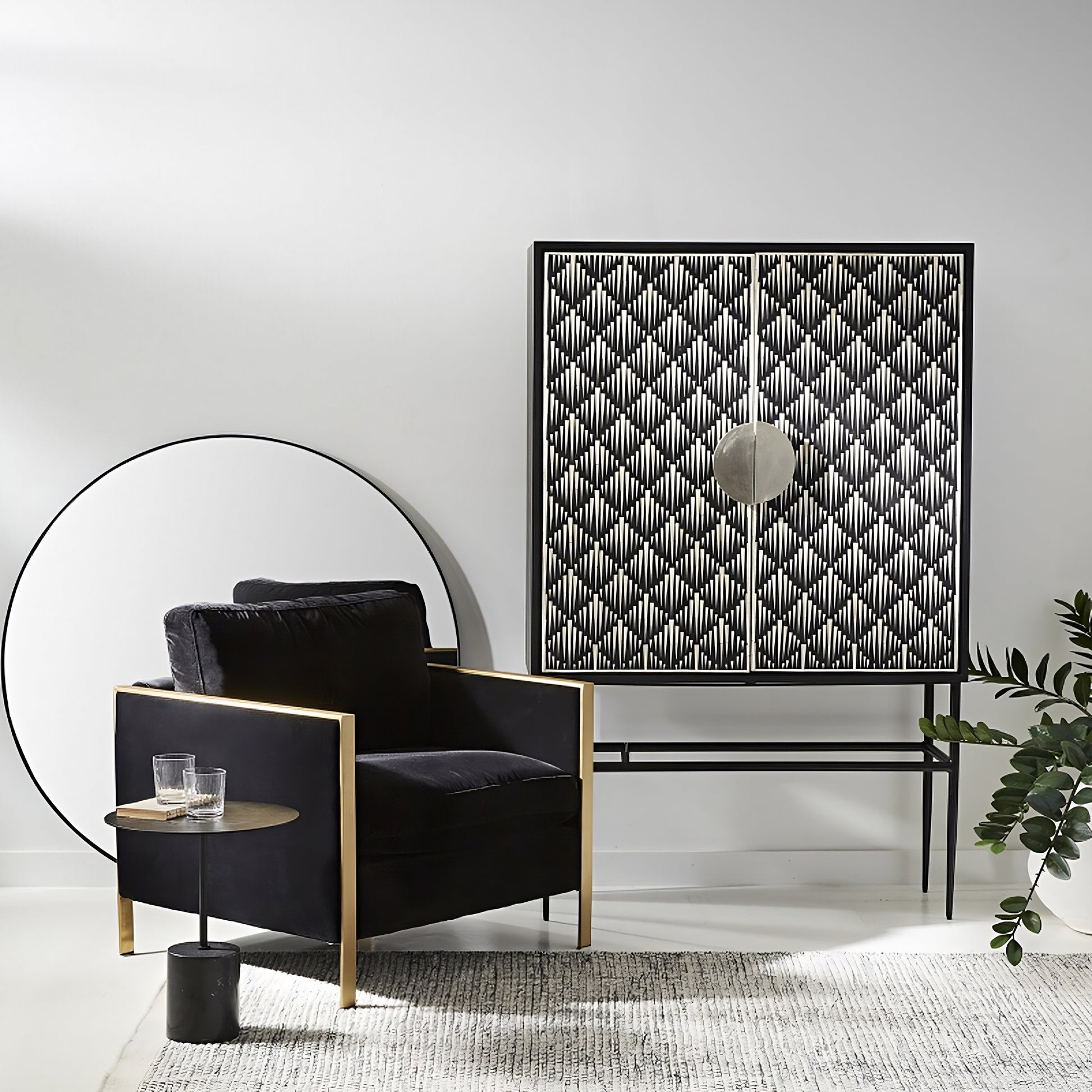Totally unique and one of a kind, this small, bone-inlay Indian Black Rain Pattern is inlaid with fragments of mirrored glass. Each fragment of glass is hand cut with special glass-cutting scissors, and then laid out by skilled craftsmen in these Rangoli patterns. The effect as you walk past this chest is to see a shimmer of repeating reflections. If you become the proud owner of this hand-crafted inlaid Black Rain Pattern you could also order another glass inlaid item in the same color using our bespoke order service. Keep the room’s accessories minimal in order to emphasize the rich beauty of the statement piece. \n