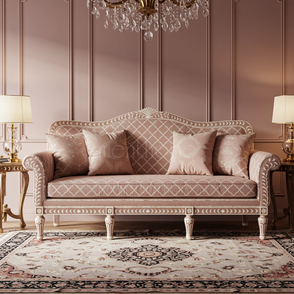 This luxury vintage-style inlay sofa features intricate hand-crafted inlay work on the wooden frame, combined with soft, patterned upholstery in a muted rose tone. With its curved backrest and matching cushions, the sofa offers a blend of comfort and classic elegance, perfect for enhancing sophisticated living spaces.