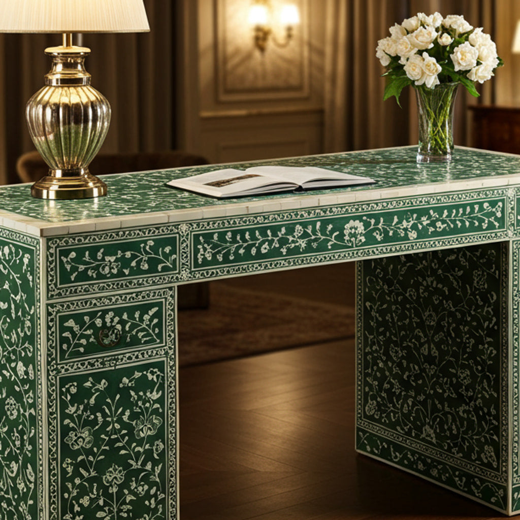 Handcrafted Green Floral Inlay Writing Desk | Luxury Handmade Desk
