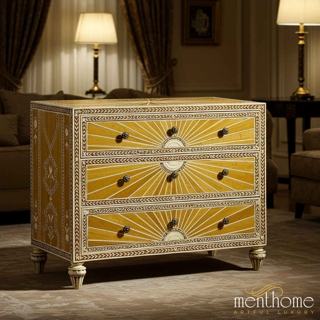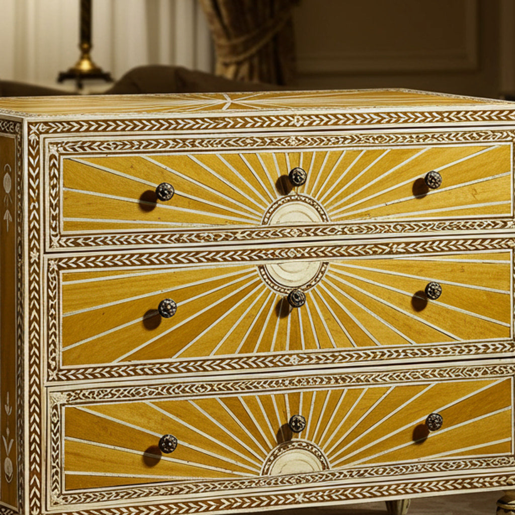 Elegant handcrafted wooden chest of drawers featuring a sunburst inlay design and intricate white border detailing. This piece combines functional storage with artistic craftsmanship and a classic vintage aesthetic, perfect for enhancing any living room, bedroom, or hallway.