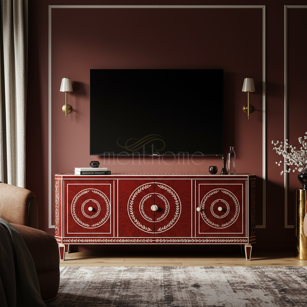 This exquisite luxury TV cabinet features intricate white inlay circular motifs on a rich, deep red finish. Designed to elevate your living space, it combines classic craftsmanship with modern functionality, offering ample storage behind elegant cabinet doors. Perfect for sophisticated interiors, it stands as a statement piece beneath your flat-screen TV.