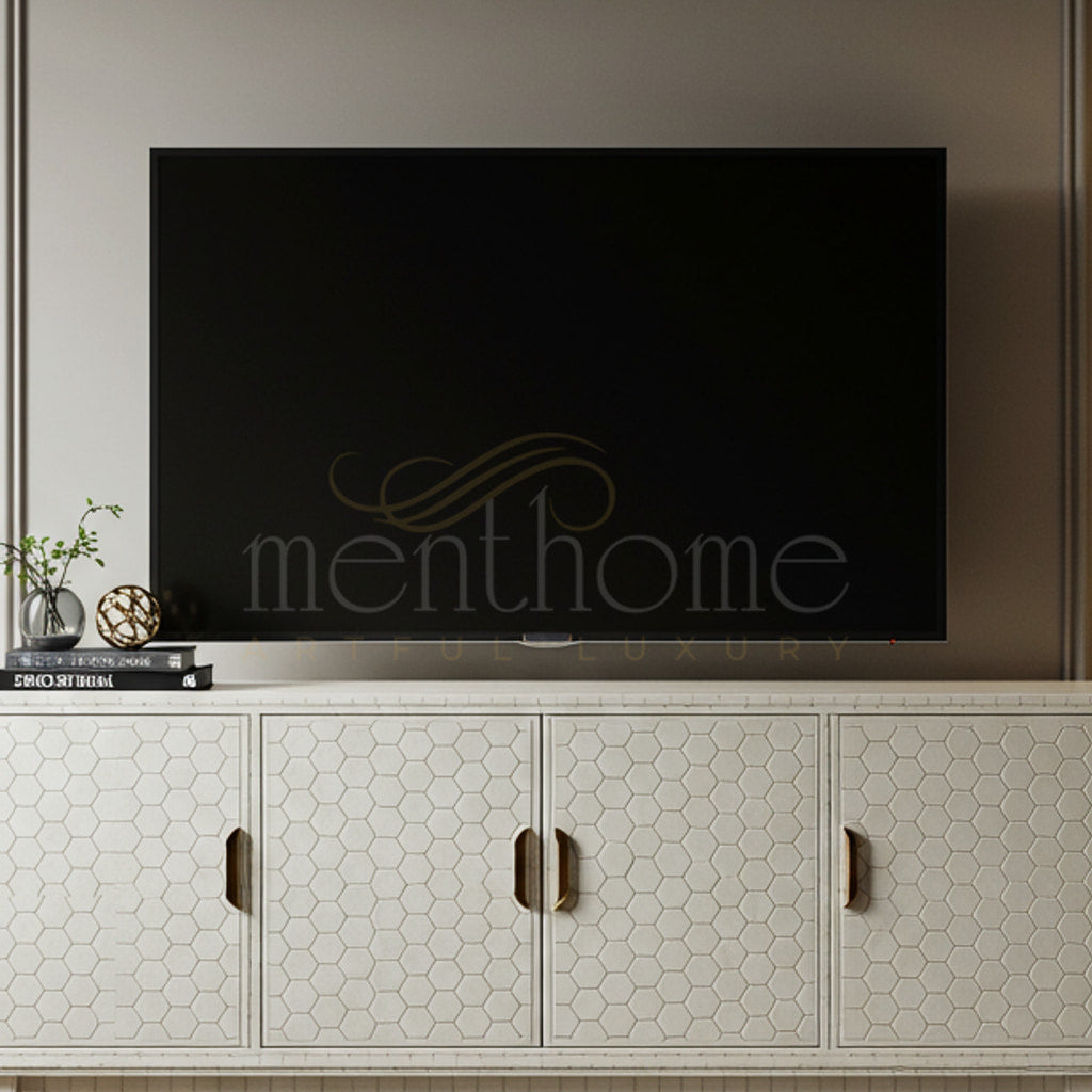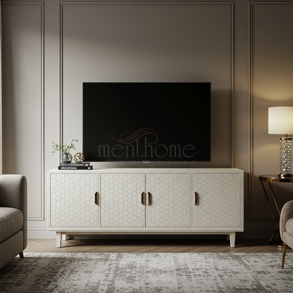 This exquisite inlay TV cabinet features a sophisticated hexagonal pattern on its doors, offering both elegance and functionality. Crafted with premium materials, it boasts four spacious compartments ideal for modern media storage, seamlessly blending luxury with everyday practicality.