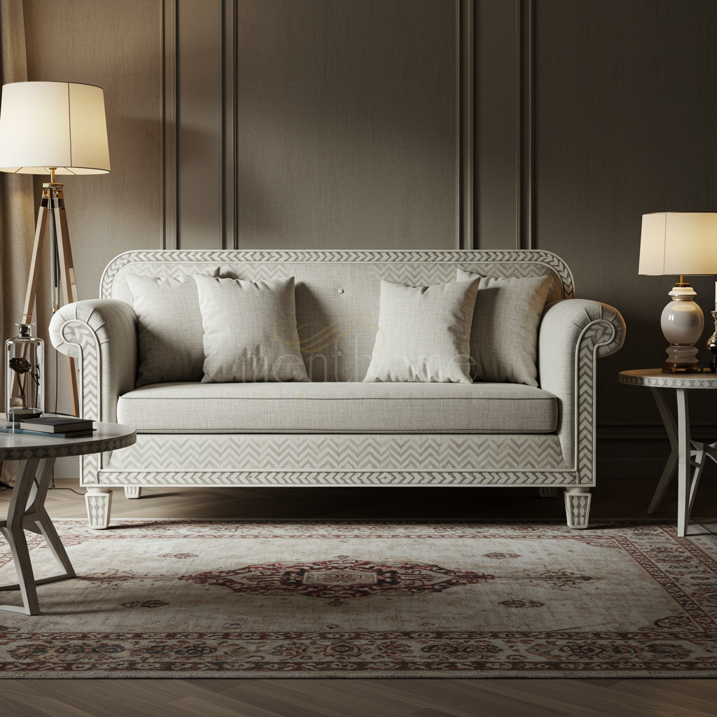 This exquisite inlay sofa features a refined, intricate chevron pattern embellishing its frame and arms, paired with plush, neutral-toned cushions for supreme comfort and style. Perfectly suited for sophisticated living rooms, it blends traditional craftsmanship with modern elegance.