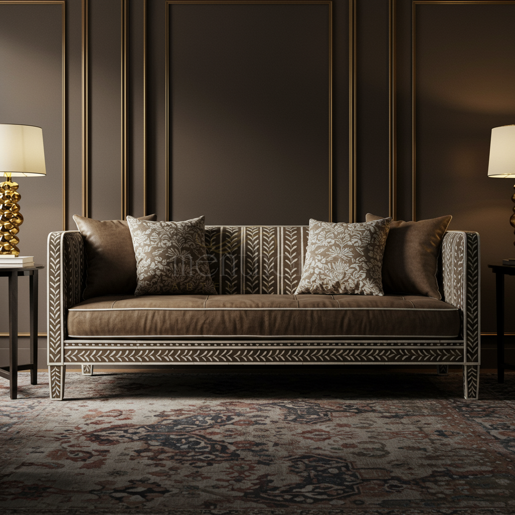 This exquisite inlay sofa showcases a rich brown upholstery adorned with intricate white floral and leaf patterns. Crafted with attention to detail, the sofa features comfortable cushions that perfectly complement the artistic inlay design on the frame and legs. Ideal for creating an elegant and cozy living room ambiance.