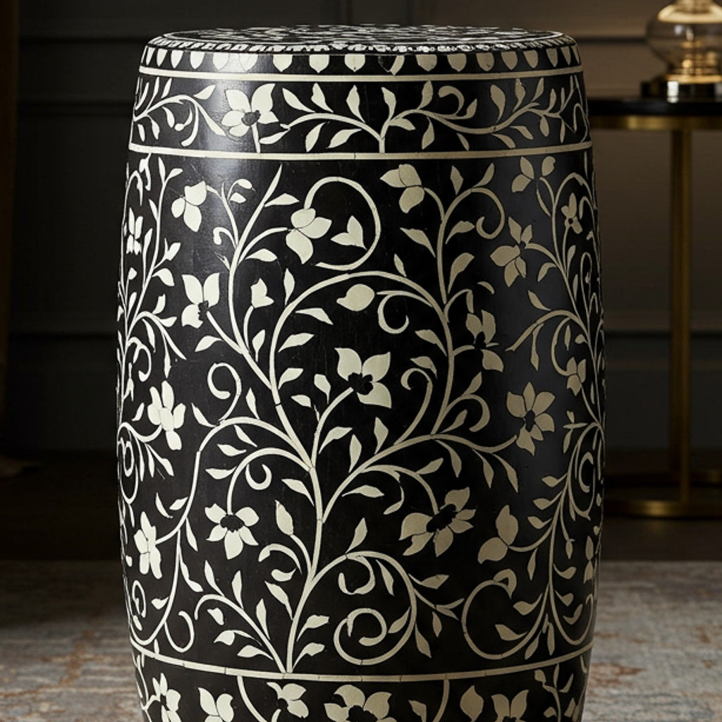 A stylish and elegant bone/mother-of-pearl inlay garden stool featuring a black base with intricate white floral patterns. Perfect for indoor or outdoor use, this stool adds a decorative touch to any space while serving as an extra seat or side table.