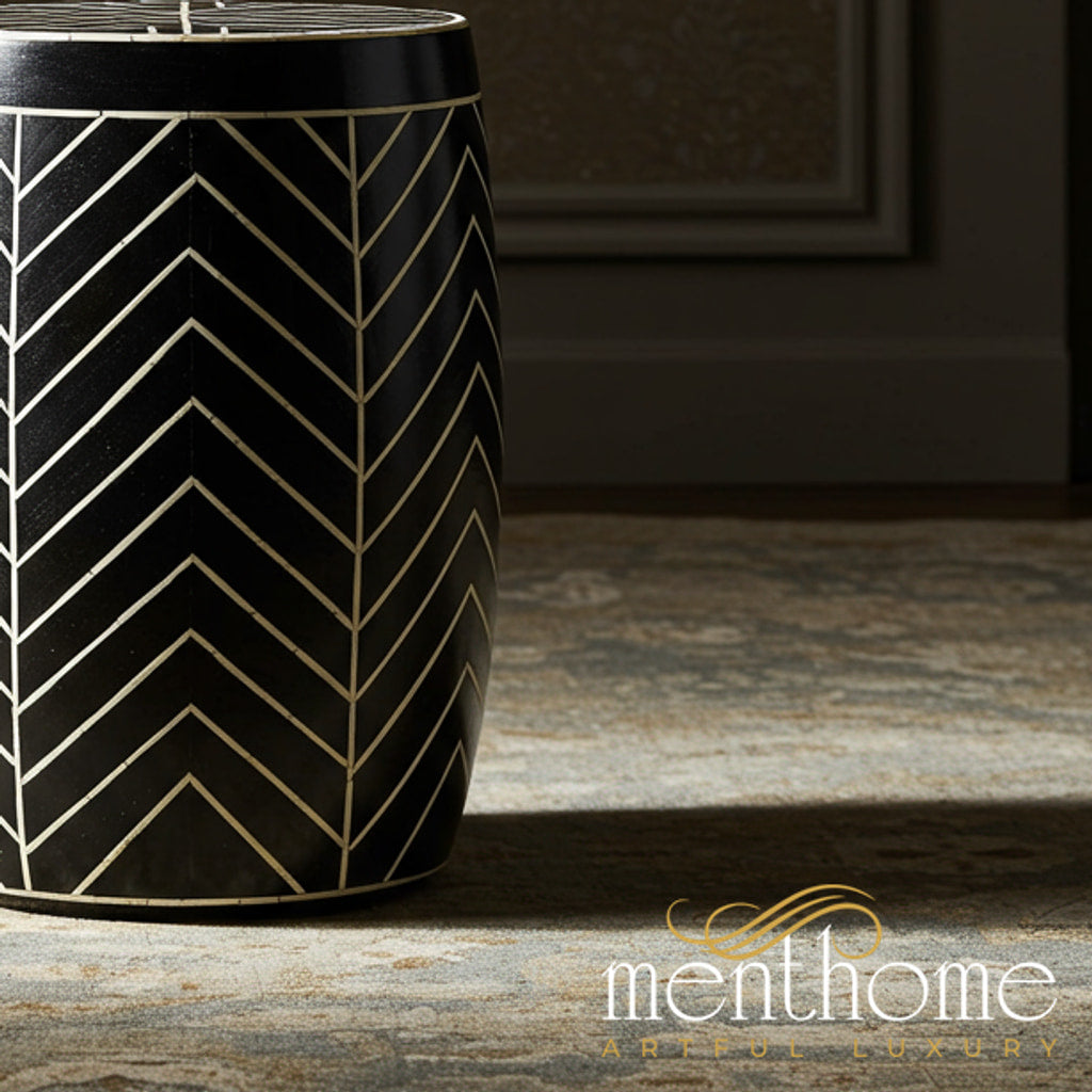 A stylish and versatile black bone/mother-of-pearl inlay accent stool featuring a white geometric chevron pattern. Perfect for adding a contemporary touch to any living space, this stool can serve as extra seating, a side table, or decorative piece.