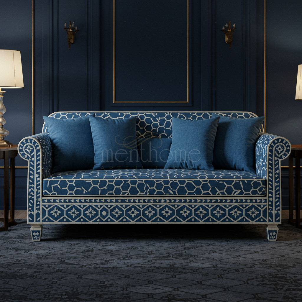 A luxurious inlay sofa featuring intricate white geometric and floral patterns against a rich blue fabric base. The sofa includes four plush blue cushions for added comfort. The elegant design is enhanced by the rolled arms and finely detailed inlay work, making it a centerpiece for sophisticated living spaces.