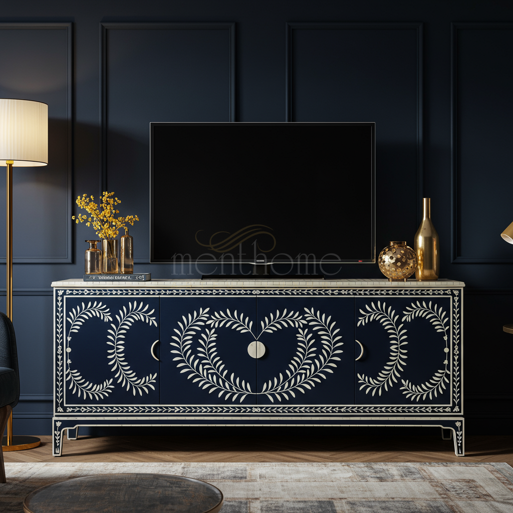 This exquisitely crafted inlay TV cabinet features a deep blue finish adorned with intricate white botanical patterns, providing a stunning contrast and elegant aesthetic. Designed for modern luxury living rooms, it offers ample storage behind its four doors, perfect for organizing media devices and accessories while enhancing your décor.