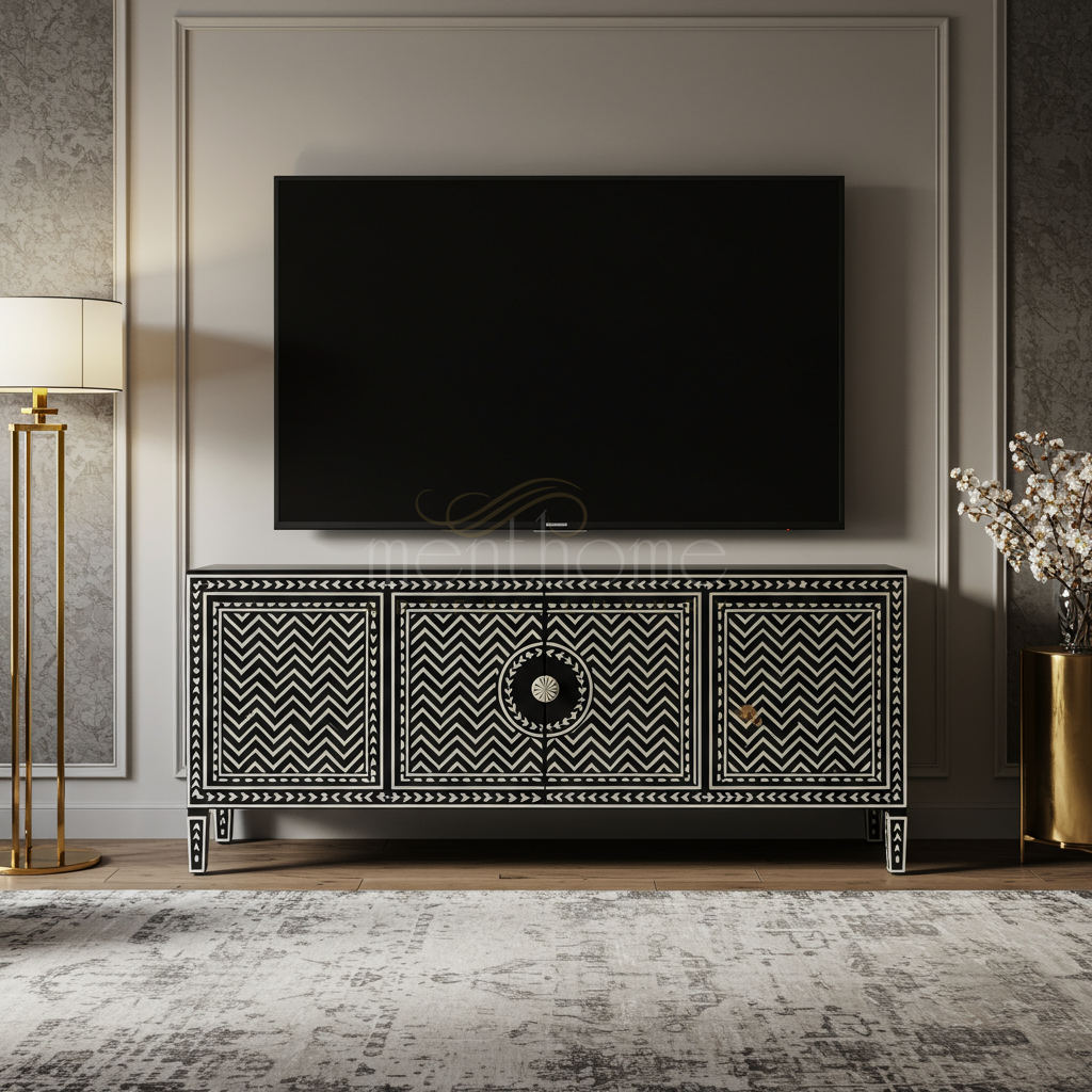 This elegant TV cabinet features a striking black and white chevron inlay pattern, expertly crafted to bring a unique, luxurious touch to any living space. With three compartments offering ample storage, it combines functionality with artisanal beauty. The understated feet and intricate detailing make it a perfect centerpiece for sophisticated modern and classic interiors.