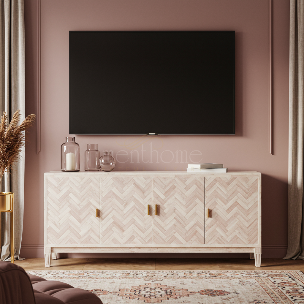 A sophisticated inlay TV cabinet featuring a distinctive herringbone pattern and brass handles. Crafted with precision to blend functionality and elegance, it offers ample storage space while enhancing the aesthetic of upscale living rooms.