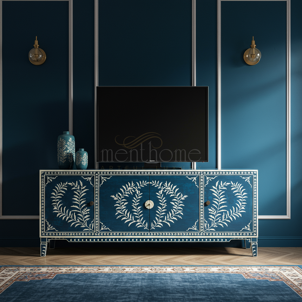 Regal Blue Inlay TV Cabinet with Floral Motif | Luxury Handmade TV Cabinet