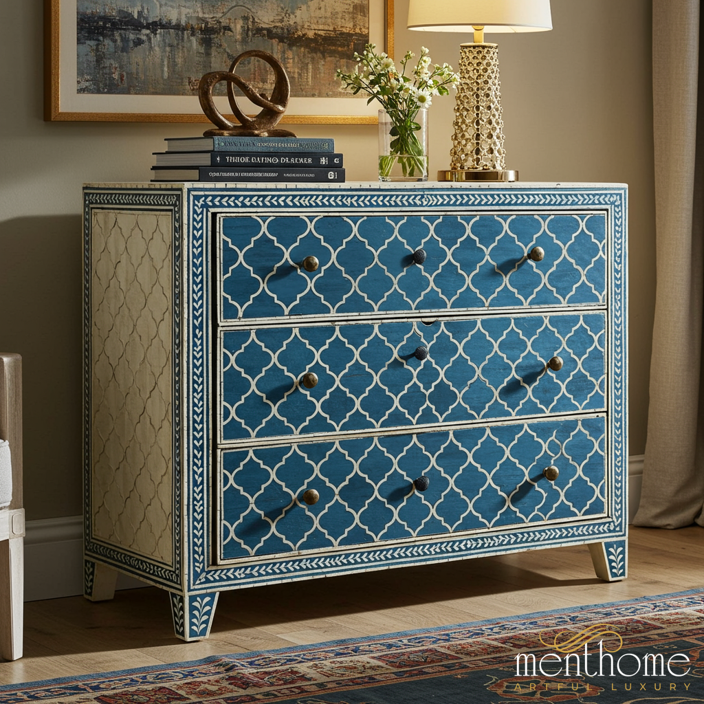 This elegant three-drawer chest features a vintage-inspired blue and cream geometric pattern, perfect for adding a touch of classic charm to any room. Crafted with attention to detail, the chest offers ample storage space while its sophisticated design complements various interior styles.
