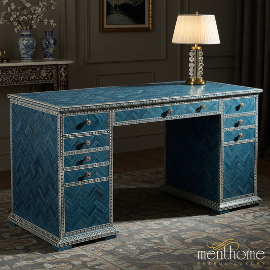 Luxury Blue Patterned Wooden Desk with Multiple Drawers | Luxury Handmade Desk
