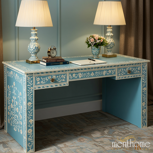 Bone Inlay Light Blue Desk | Unique Geometric Design | Artisan-Crafted Luxury for Your Workspace | Luxury Handmade Desk