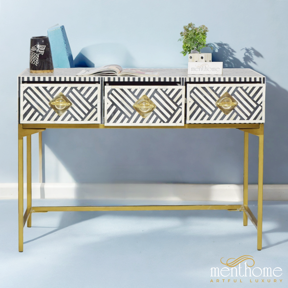 Black 3-Drawer Optical Pattern Bone Inlay Desk with Brass Leg | Luxury Handmade Desk