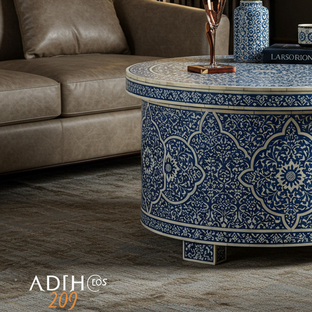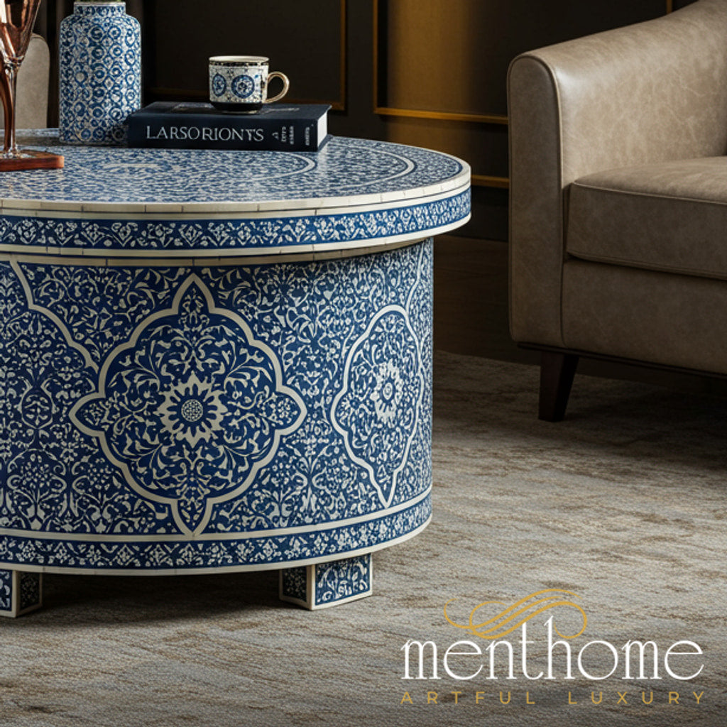 Blue and White Ornate Round Coffee Table | Luxury Handmade Coffee Table