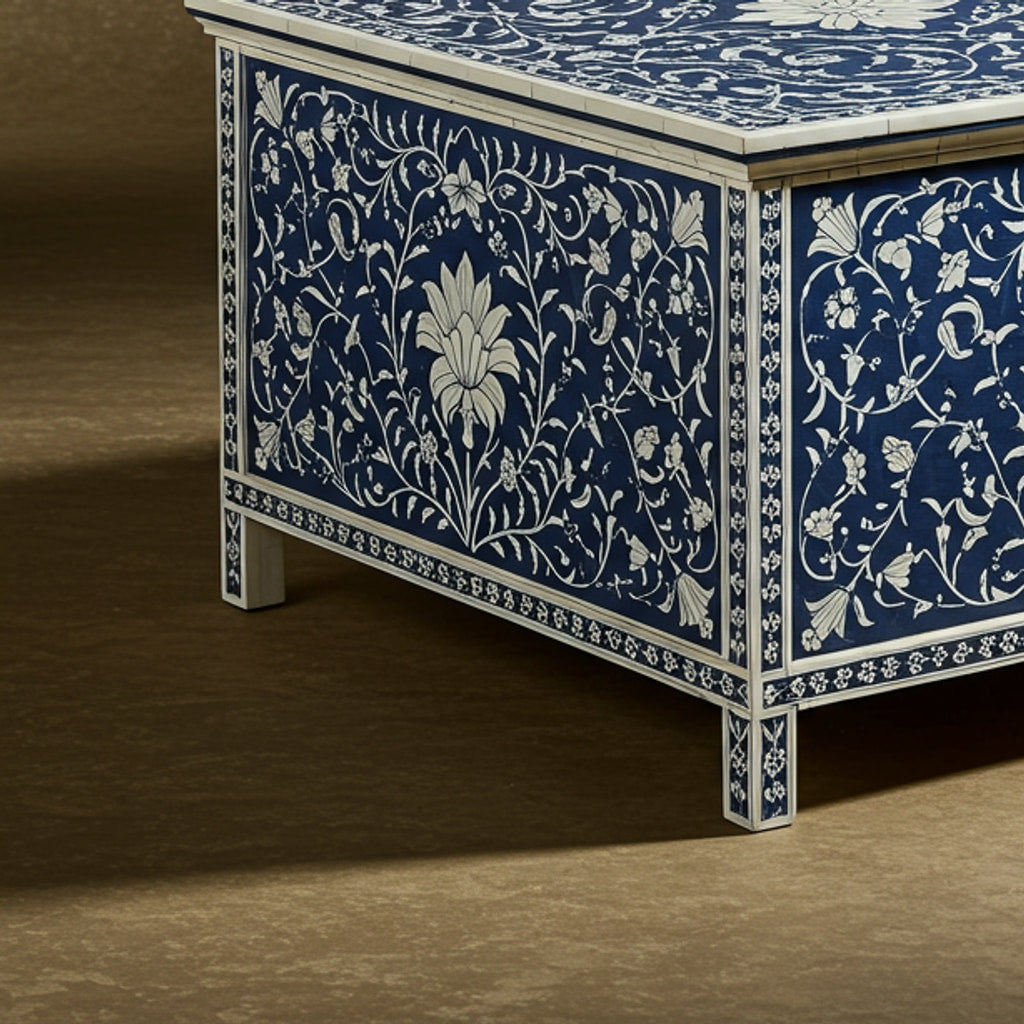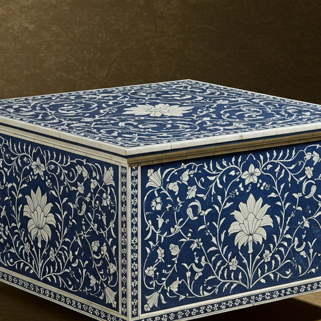 A beautifully crafted square coffee table featuring intricate white floral inlay designs on a rich blue background. This piece combines traditional artistry with functionality, adding a touch of elegance to any living space.