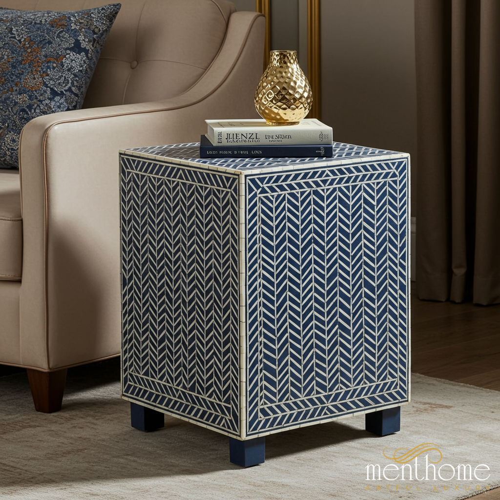 Blue Patterned Side Table with Bone Inlay | Luxury Handmade Side Table