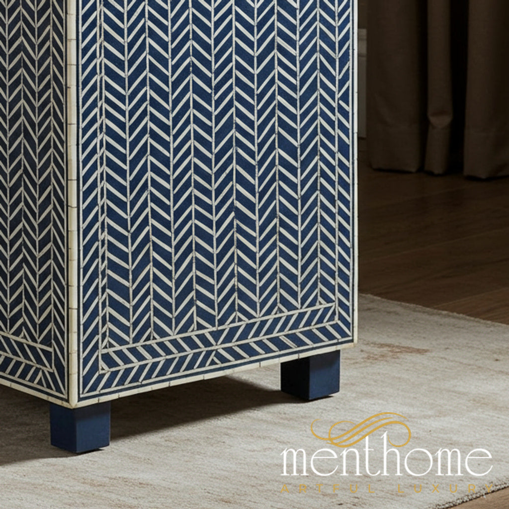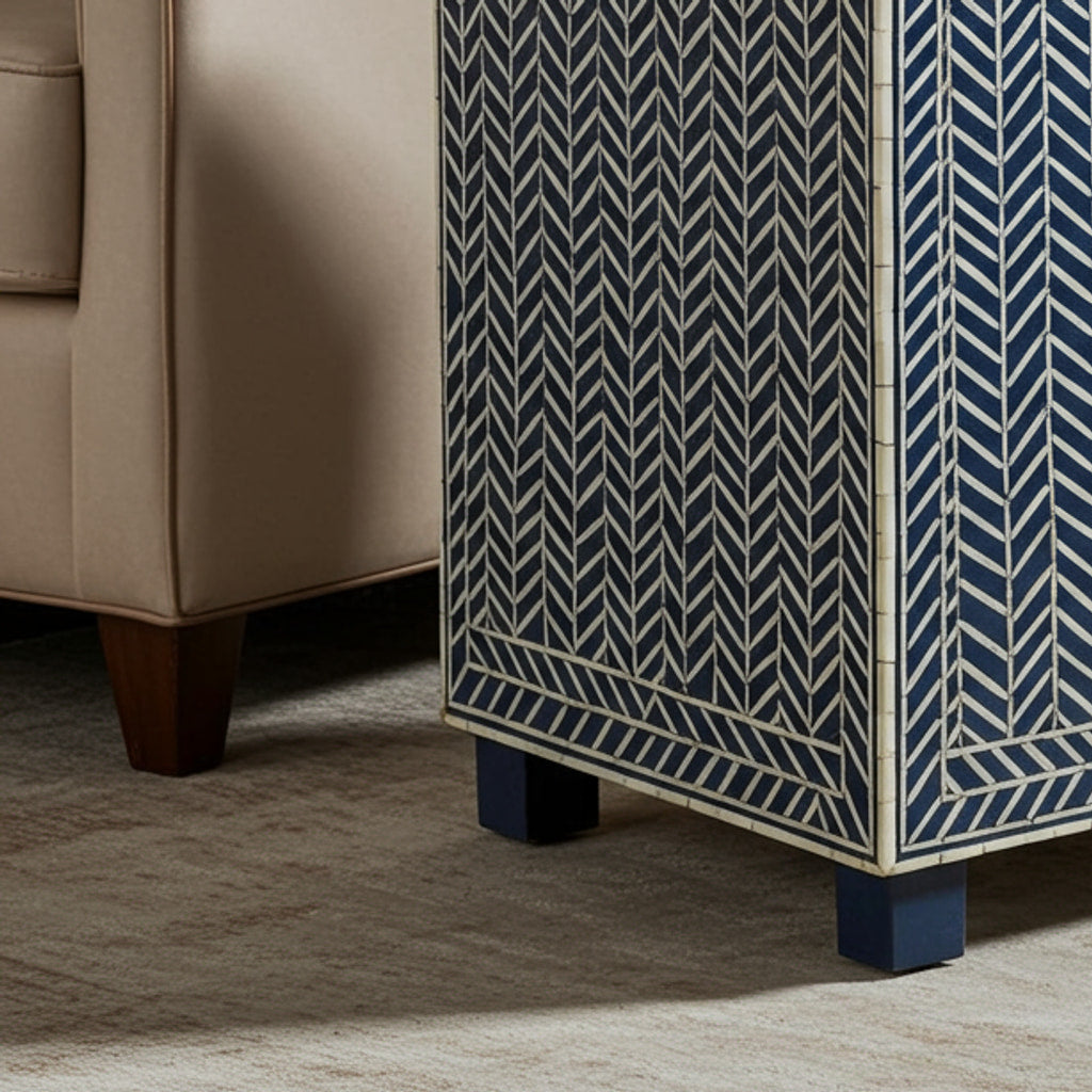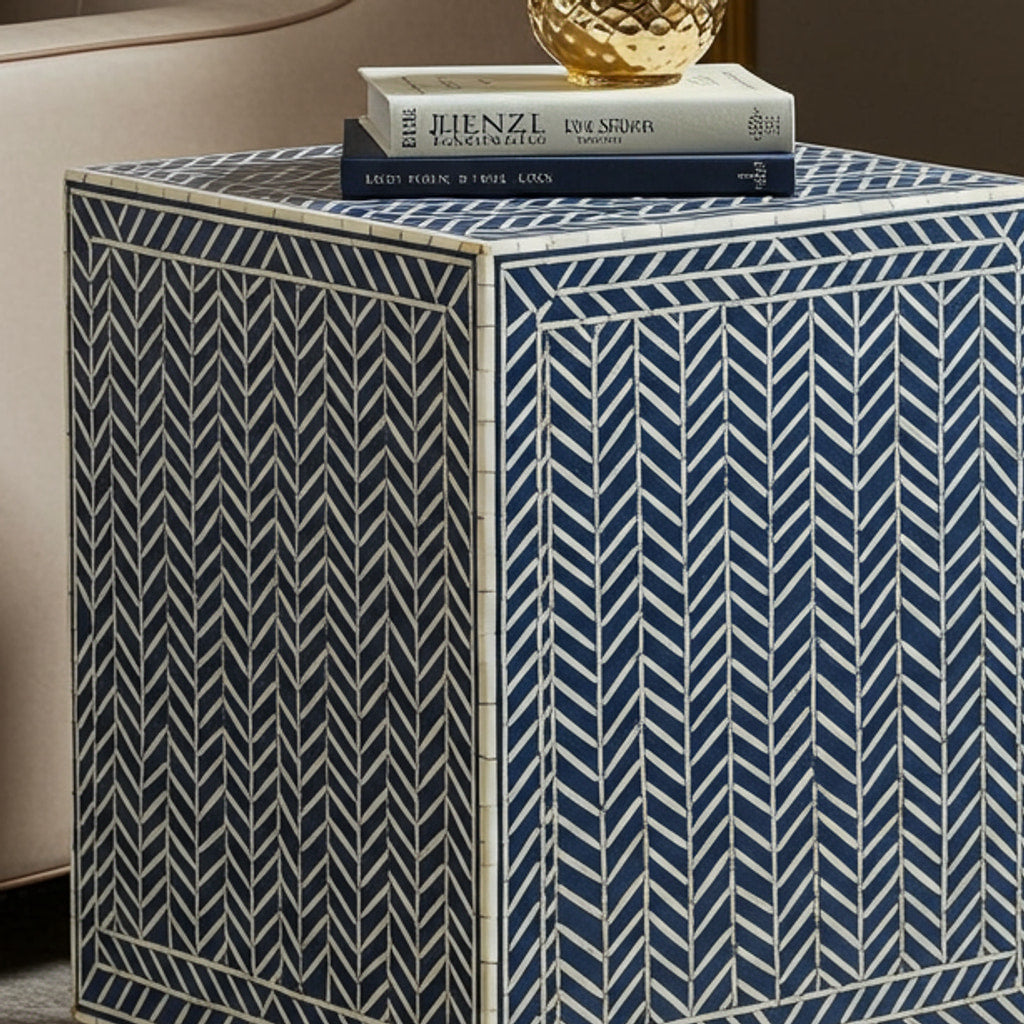 This stylish side table features a beautiful blue and white chevron pattern created with intricate bone inlay. Perfect for adding a touch of elegance and sophistication to any living room or lounge area.